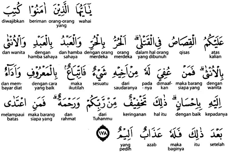 Kemenag RI 2019 : Wahai orang-orang yang beriman, diwajibkan kepadamu (melaksanakan) kisas berkenaan dengan orang-orang yang dibunuh. Orang merdeka dengan orang merdeka, hamba sahaya dengan hamba sahaya, dan perempuan dengan perempuan. Siapa yang memperoleh maaf dari saudaranya hendaklah mengikutinya dengan cara yang patut dan hendaklah menunaikan kepadanya dengan cara yang baik.48) Yang demikian itu adalah keringanan dan rahmat dari Tuhanmu. Siapa yang melampaui batas setelah itu, maka ia akan mendapat azab yang sangat pedih. Prof. Quraish Shihab : Hai orang-orang yang beriman! Diwajibkan atas kamu qishas‘² berkenaan dengan orang-orang yang dibunuh; (dengan ketentuan bahwa) orang merdeka dengan orang merdeka, hamba sahaya dengan hamba sahaya, dan wanita dengan wanita. Maka, barang siapa mendapat suatu pemaafan dari saudaranya, hendaklah (yang memaafkan) mengikuti dengan cara yang patut,¹³ dan hendaklah (yang diberi maaf) membayar (tebusan) kepadanya (yang memberi maaf) dengan cara yang baik.`¹? Yang demikian itu adalah suatu keringanan dari Tuhan Pemelihara kamu dan suatu rahmat. Maka, barang siapa melanggar batas sesudah itu, maka baginya azab yang sangat pedih. Prof. HAMKA : Wahai, orang-orang yang beriman! Diwajibkan atas kamu hukum qishash pada orang-orang yang terbunuh; orang merdeka dengan orang merdeka dan hamba sahaya dengan hamba sahaya dan perempuan dengan perempuan. Akan tetapi, barangsiapa yang diampunkan untuknya dari saudaranya sebagian maka hendaklah mengikuti dengan yang baik, dan tunaikan kepadanya dengan cara yang baik. Demikianlah keringanan dari Tuhanmu dan rahmat. Akan tetapi, barang siapa yang (masih) melanggar sesudah demikian maka untuknya adalah adzab yang pedih.
