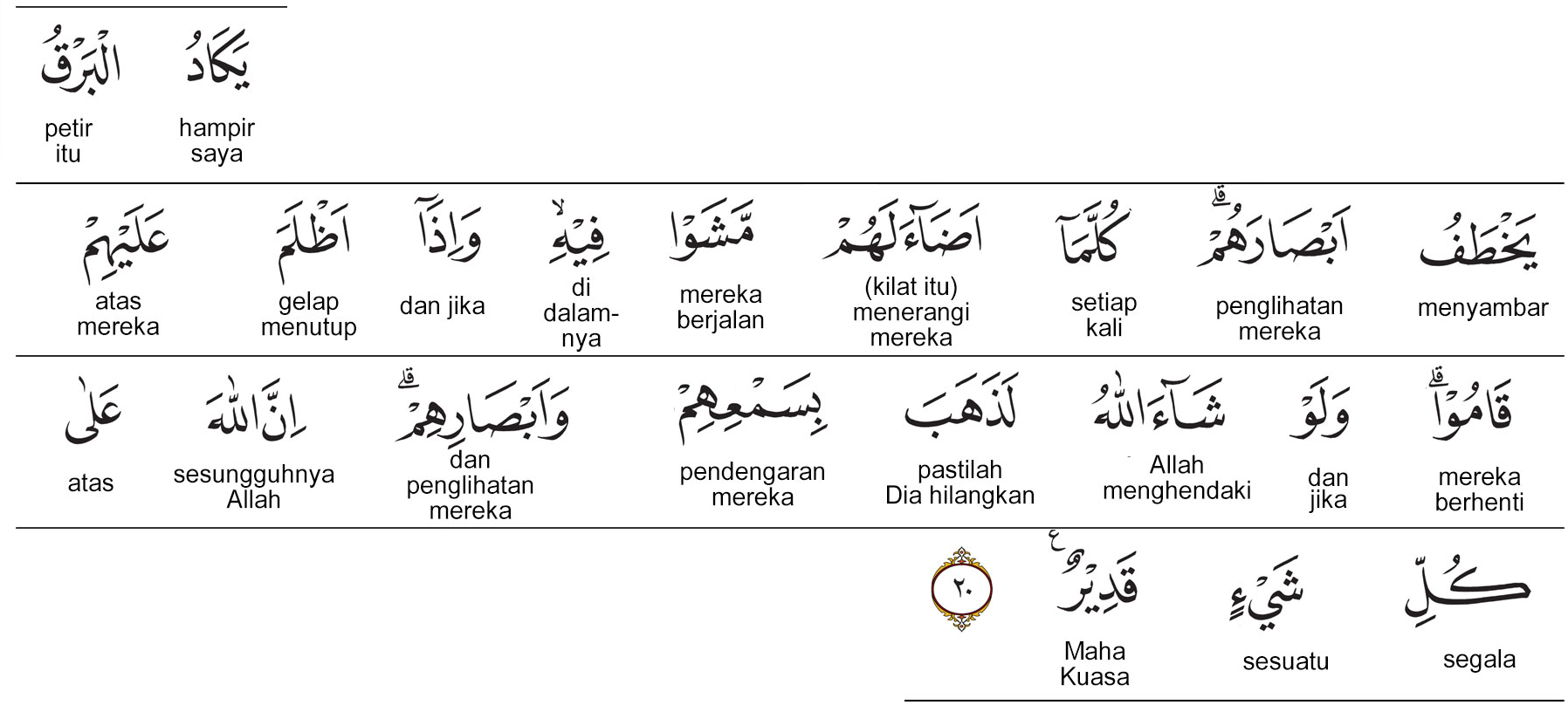 Kemenag RI 2019 : Hampir saja kilat itu menyambar penglihatan mereka. Setiap kali (kilat itu) menyinari, mereka berjalan di bawah (sinar) itu. Apabila gelap menerpa mereka, mereka berdiri (tidak bergerak). Sekiranya Allah menghendaki, niscaya Dia menghilangkan pendengaran dan penglihatan mereka. Sesungguhnya Allah Maha Kuasa atas segala sesuatu. Prof. Quraish Shihab : Hampir saja kilat itu menyambar penglihatan mereka. Setiap kali (kilat itu) menyinari mereka, mereka berjalan di bawahnya (sinar itu), dan apabila gelap menimpa mereka, mereka berdiri (tidak bergerak). Dan jika seandainya Allah menghendaki, pasti Dia melenyapkan pendengaran dan penglihatan mereka. Sesungguhnya Allah Maha Kuasa atas segala sesuatu. Prof. HAMKA :