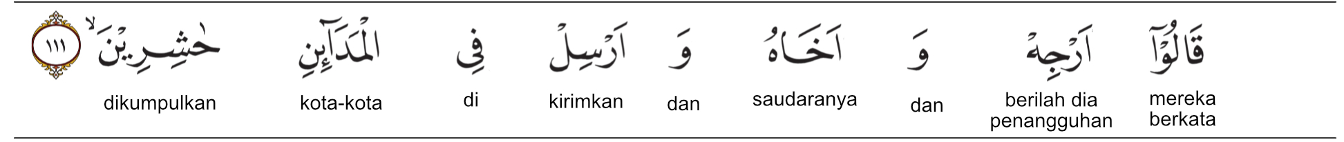 Kemenag RI 2019:Mereka (para pemuka) itu menjawab, “Beri tangguhlah dia dan saudaranya dan utuslah ke kota-kota beberapa orang untuk mengumpulkan (para penyihir) Prof. Quraish Shihab:Mereka (para pemuka kaum Firaun) berkata: “Beri tangguhlah dia dan saudaranya (Nabi Harun as.) serta kirimlah ke kota-kota (beberapa orang yang) akan mengumpulkan (para ahli sihir), Prof. HAMKA:Mereka berkata, “Berilah dia dan saudaranya kesempatan dan kirimlah (utusan-utusan) ke kota-kota buat mengumpulkan orang.