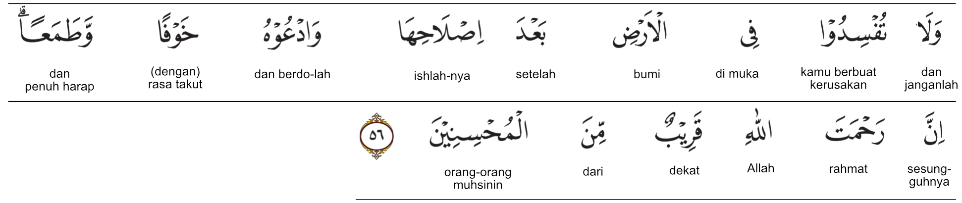 Prof. Quraish Shihab: Dan janganlah kamu berbuat kerusakan di bumi sesudah perbaikannya dan berdoalah kepada-Nya dalam keadaan takut dan penuh harap. Sesungguhnya rahmat Allah sangat dekat kepada orang-orang muhsin.