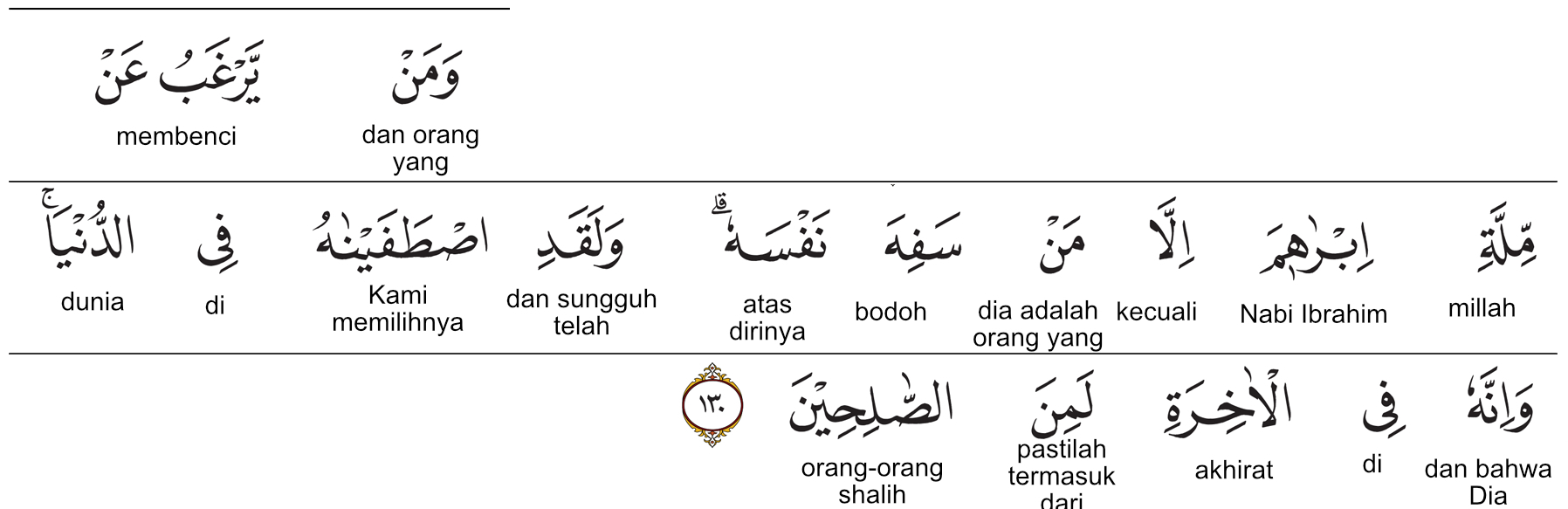 Kemenag RI 2019:Siapa yang membenci agama Ibrahim selain orang yang memperbodoh dirinya sendiri? Kami benar-benar telah memilihnya (Ibrahim) di dunia ini dan sesungguhnya di akhirat dia termasuk orang-orang saleh. Prof. Quraish Shihab:Tidak ada orang yang benci kepada agama Ibrahim, melainkan orang yang memperbodoh diri sendiri, dan demi (keagungan dan kekuasaan Kami)! Sungguh, Kami telah memilihnya (Nabi Ibrahim as>) di dunia dan sesungguhnya dia di akhirat benar-benar termasuk orang-orang saleh. Prof. HAMKA:130. Dan siapakah yang akan enggan dari agama Ibrahim kalau bukan orang yang telah memperbodoh dirinya? Padahal sesungguhnya Kami telah memilih dia di dunia ini, dan sesungguhnya dia di akhirat adalah dari orang-orang yang saleh.