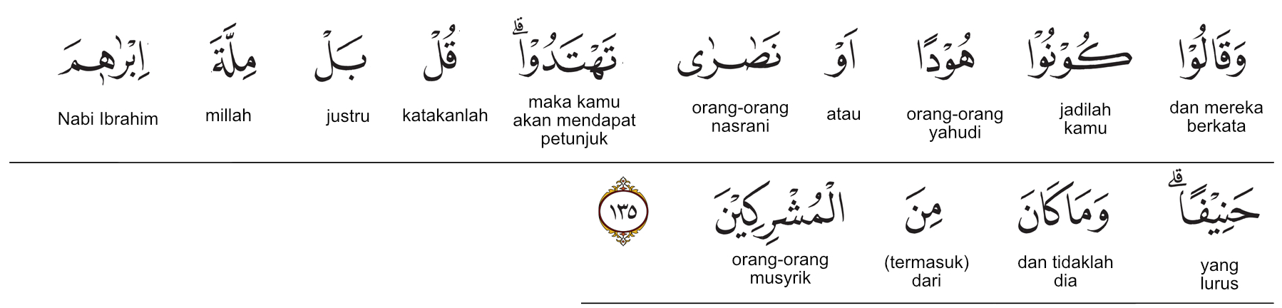 Kemenag RI 2019:Mereka berkata, “Jadilah kamu (penganut) Yahudi atau Nasrani, niscaya kamu mendapat petunjuk.” Katakanlah, “(Tidak.) Akan tetapi, (kami mengikuti) agama Ibrahim yang lurus dan dia tidak termasuk orang-orang musyrik.” Prof. Quraish Shihab:Dan mereka berkata (sesuai dengan agama masing-masing): “Jadilah kamu penganut Yahudi atau Nasrani, (niscaya) kamu mendapat petunjuk.” Katakanlah (Nabi Muhammad saw.): “(Tidak!), bahkan (kami mengikuti) agama Ibrahim yang lurus (tidak cenderung kepada kebatilan dan jauh dari kepercayaan sesat), dan bukanlah dia (Nabi Ibrahim as.) termasuk (golongan) orang-orang musyrik.” Prof. HAMKA:Dan mereka berkata, "Menjadilah kamu Yahudi atau Nasrani supaya kamu dapat petunjuk." Katakanlah, "Bahkan agama Ibrahim yang lurus dan bukanlah dia dari orang-orang yang musyrik."