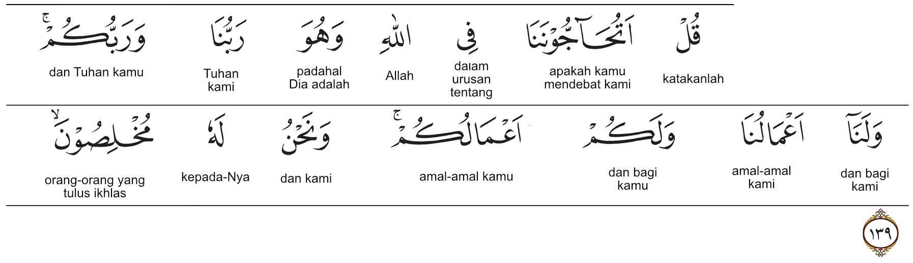 Kemenag RI 2019: Katakanlah (Nabi Muhammad), “Apakah kamu (Yahudi dan Nasrani) hendak berdebat dengan kami tentang Allah? Padahal, Dia adalah Tuhan kami dan Tuhan kamu. Bagi kami amalan kami, bagi kamu amalan kamu. Hanya kepada-Nya kami dengan tulus mengabdikan diri.