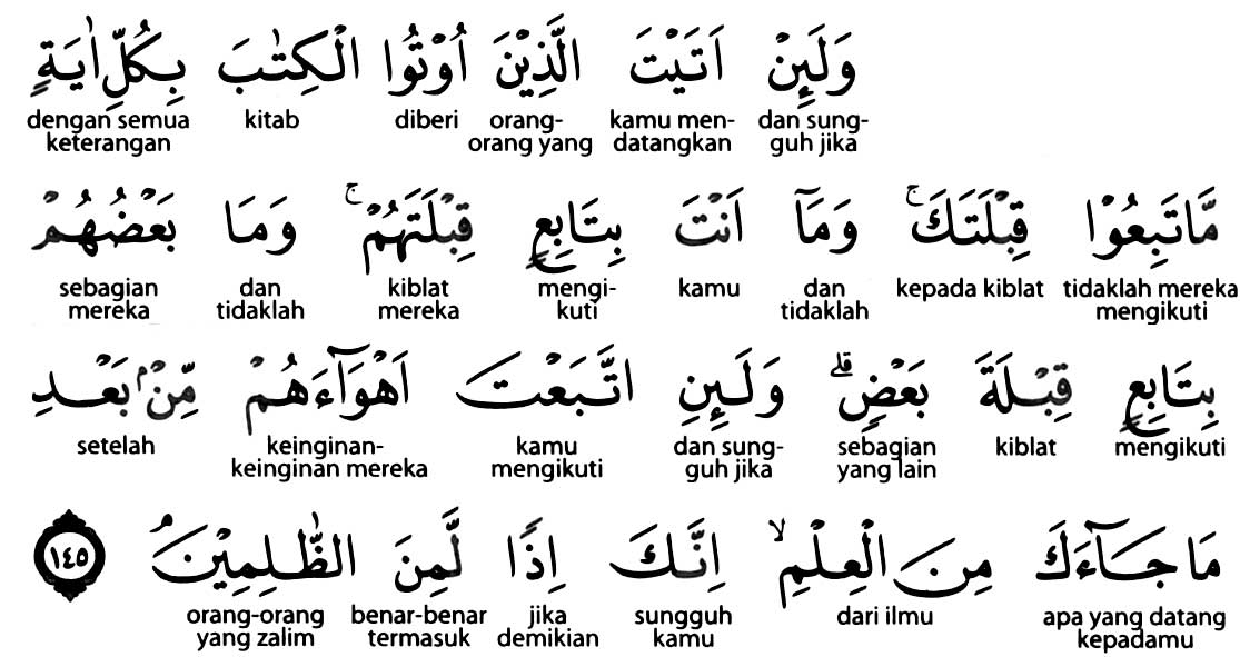 Kemenag RI 2019:Sungguh, jika engkau (Nabi Muhammad) mendatangkan ayat-ayat (keterangan) kepada orang-orang yang diberi kitab itu, mereka tidak akan mengikuti kiblatmu. Engkau pun tidak akan mengikuti kiblat mereka. Sebagian mereka (pun) tidak akan mengikuti kiblat sebagian yang lain. Sungguh, jika engkau mengikuti keinginan mereka setelah sampai ilmu kepadamu, niscaya engkau termasuk orang-orang zalim. Prof. Quraish Shihab:Dan jika engkau (Nabi Muhammad saw.) benar-benar mendatangkan semua ayat kepada orang-orang yang diberi al-Kitab (Taurat dan Injil), mereka tidak akan mengikuti kiblatmu, dan engkau (pun) tidak akan mengikuti kiblat mereka, dan sebagian mereka (pun) tidak akan mengikuti kiblat sebagian yang lain. Dan jika engkau benar-benar mengikuti keinginan mereka setelah datang ilmu kepadamu, sesungguhnya engkau—kalau demikian—tentu termasuk (golongan) orang-orang zalim. Prof. HAMKA:Dan meskipun engkau beri orang-orang yang diberi kitab itu dengan tiap-tiap keterangan, tidaklah mereka akan mengikut kiblat engkau itu. Dan, engkau pun tidaklah akan mengikut kiblat mereka. Dan, tidaklah yang sebagian mereka akan mengikut kiblat yang sebagian. Dan, jikalau engkau perturutkan kemauan-kemauan mereka sesudah datang kepada engkau sebagian dari pengetahuan, sesungguhnya adalah engkau di masa itu dari orang-orang yang aniaya.