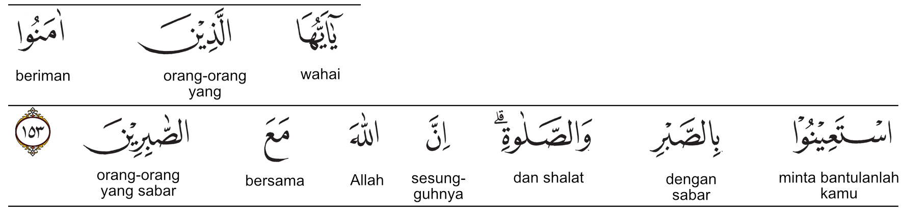 Kemenag RI 2019:Wahai orang-orang yang beriman, mohonlah pertolongan (kepada Allah) dengan sabar dan salat. Sesungguhnya Allah beserta orang-orang yang sabar. Prof. Quraish Shihab:Hai orang-orang yang beriman! Mohonlah pertolongan (kepada Allah swt.) dengan sabar dan (mengerjakan) shalat, sesungguhnya Allah bersama orang-orang yang sabar. Prof. HAMKA:Wahai, orang-orang yang beriman! Mohonlah pertolongan dengan sabar dan shalat; sesungguhnya Allah adalah beserta orang-orang yangsabar.