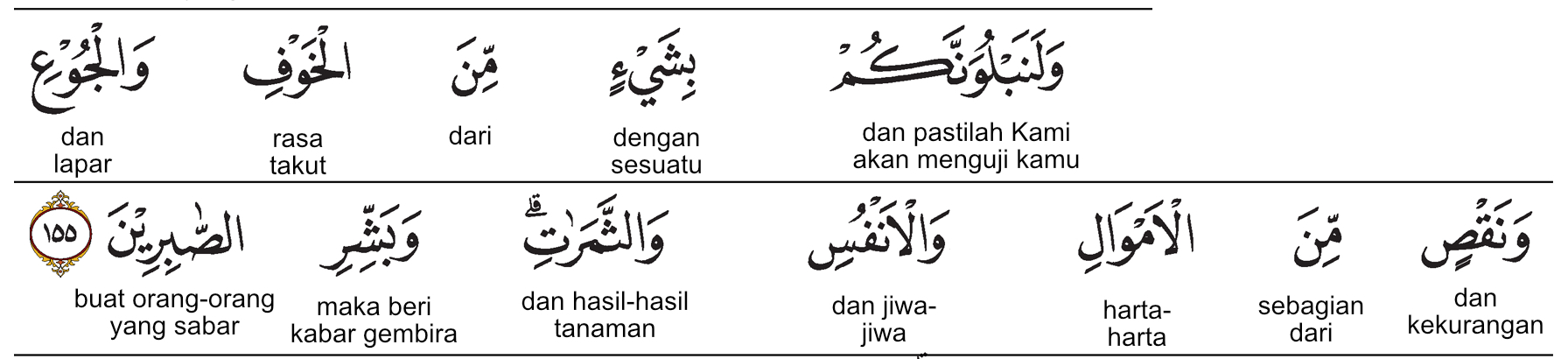 Kemenag RI 2019:Kami pasti akan mengujimu dengan sedikit ketakutan dan kelaparan, kekurangan harta, jiwa, dan buah-buahan. Sampaikanlah (wahai Nabi Muhammad,) kabar gembira kepada orang-orang sabar, Prof. Quraish Shihab:Dan sungguh, Kami pasti akan (terus menerus) menguji kamu dengan sedikit ketakutan, kelaparan, kekurangan harta, jiwa dan buah-buahan. Dan sampaikanlah kabar gembira kepada orang-orang sabar. Prof. HAMKA:Dan sesungguhnya akan Kami beri kamu percobaan dengan sesuatu dari ketakutan dan kelaparan dan kekurangan dari harta benda dan jiwa-jiwa dan buah buahan; dan berilah kabar yang menyukakan kepada orang yang sabar.