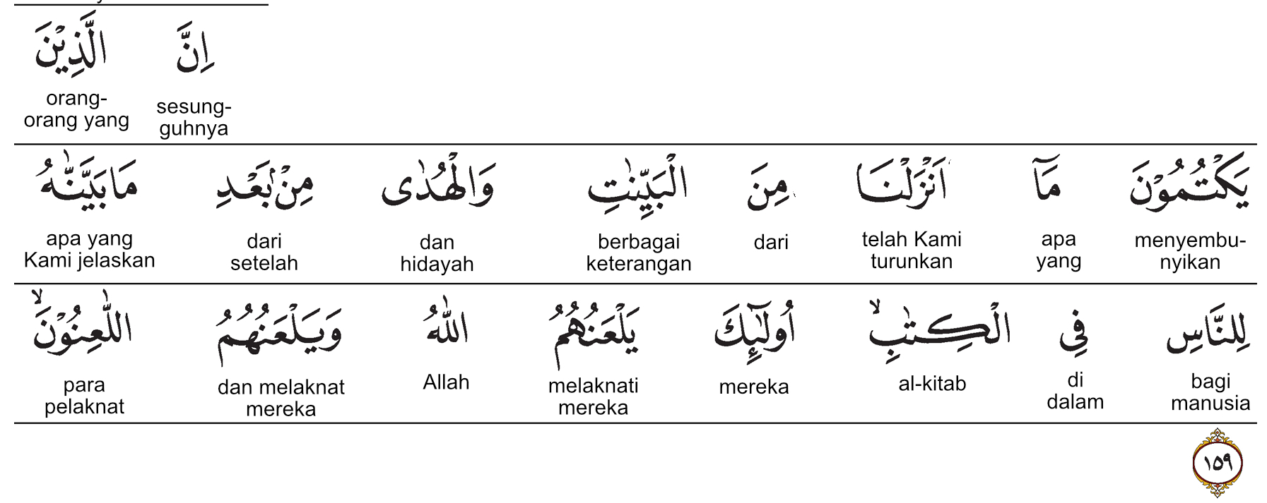 Di dalam banyak kitab tafsir klasik, ketika menjelaskan ayat ke-159 ini biasanya diikuti dengan kajian tentang haramnya kitmanul-ilm atau menyembunyikan ilmu. Meskipun konteks turunnya ayat ini sebenarnya adalah perilaku agamawan yahudi yang menyembunyikan informasi penting di dalam kitab Taurat, khususnya terkait berita tentang kenabian Muhammad SAW.