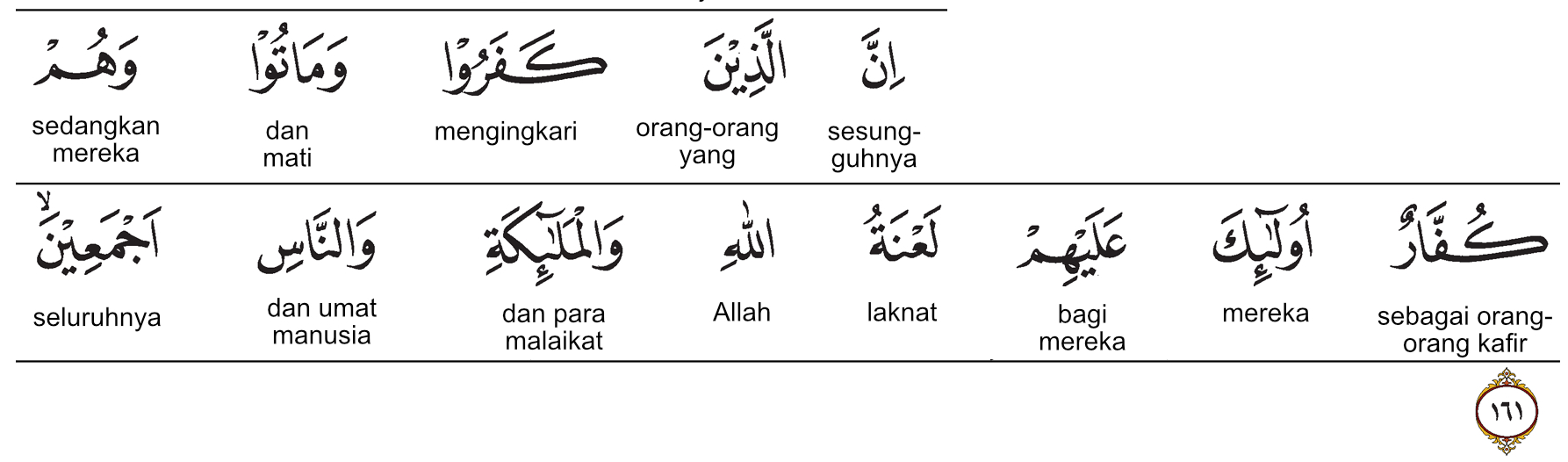 Ayat ke-161 ini memberikan sebuah informasi penting tentang perbedaan orang kafir yang mati dalam keadaan kafir, dibandingkan dengan orang yang mungkin pernah kafir tetapi kemudian dia mendapatkan hidayah dan masuk Islam, hingga akhirnya wafat dalam keadaan muslim.