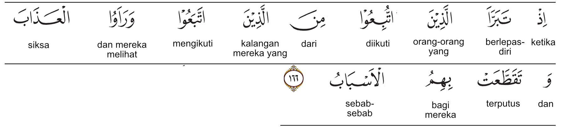 Kemenag RI 2019:(Yaitu) ketika orang-orang yang diikuti berlepas tangan dari orang-orang yang mengikuti saat mereka (orang-orang yang diikuti) melihat azab, dan (ketika) segala hubungan antara mereka terputus. Prof. Quraish Shihab:(Yaitu), ketika orang-orang yang diikuti itu berlepas diri dari orang-orang yang mengikuti-(nya), dan mereka melihat azab; dan (ketika segala) hubungan antara mereka terputus (sama sekali). Prof. HAMKA:(Yaitu) tatkala melepaskan diri orang-orang yang diikut daripada orang-orang yang mengikut, dan mereka lihatlah adzab, dan putuslah dengan mereka segala harapan.