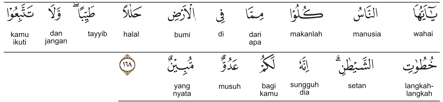 Kemenag RI 2019:Wahai manusia, makanlah sebagian (makanan) di bumi yang halal lagi baik dan janganlah mengikuti langkah-langkah setan. Sesungguhnya ia bagimu merupakan musuh yang nyata. Prof. Quraish Shihab:Hai seluruh manusia! Makanlah yang halal, lagi baik dari apa (yang terdapat) di bumi, dan janganlah kamu mengikuti langkah-langkah setan; (karena) sesungguhnya ia (setan) adalah musuh yang nyata bagi kamu. Prof. HAMKA:Wahai manusia! Makanlah dari apa yang ada di bumi ini barang yang halal lagi baik, dan jangan kamu ikuti langkah-langkah setan. Sesungguhnya, dia bagi kamu adalah musuh yang sangat nyata.
