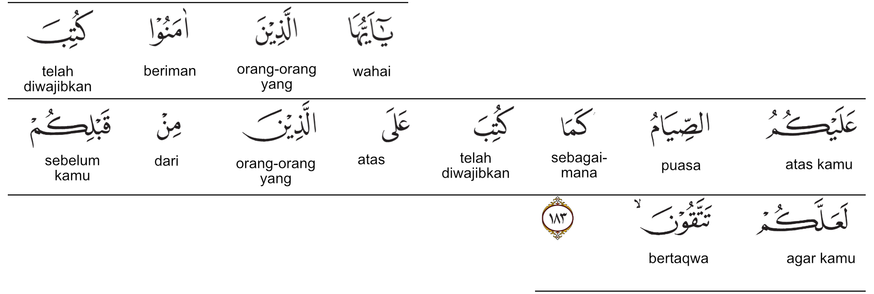 Prof. HAMKA: Wahai, orang-orang yang beriman! Diwajibkan kepada kamu puasa sebagaimana telah diwajibkan atas orang-orang yang sebelum kamu, supaya kamu menjadi orang yang bertakwa.