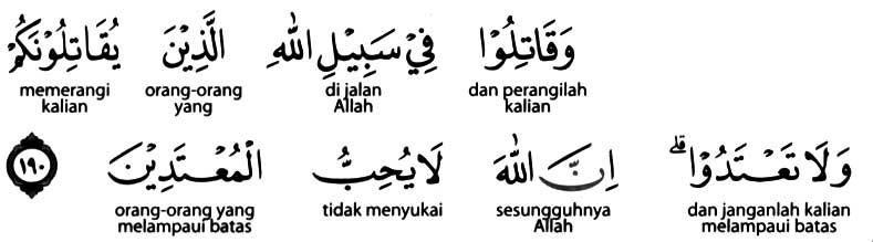 Kemenag RI 2019:Perangilah di jalan Allah orang-orang yang memerangi kamu dan jangan melampaui batas. Sesungguhnya Allah tidak menyukai orang-orang yang melampaui batas. Prof. Quraish Shihab:Perangilah di jalan Allah orang-orang yang memerangi kamu, dan janganlah kamu melampaui batas, sesungguhnya Allah tidak menyukai orang-orang yang melampaui batas. Prof. HAMKA:Dan perangilah pada jalan Allah orangorang yang memerangi kamu, tetapi janganlah melampaui batas. Sesungguhnya, Allah tidak suka kepada orang-orang yang melampaui batas.
