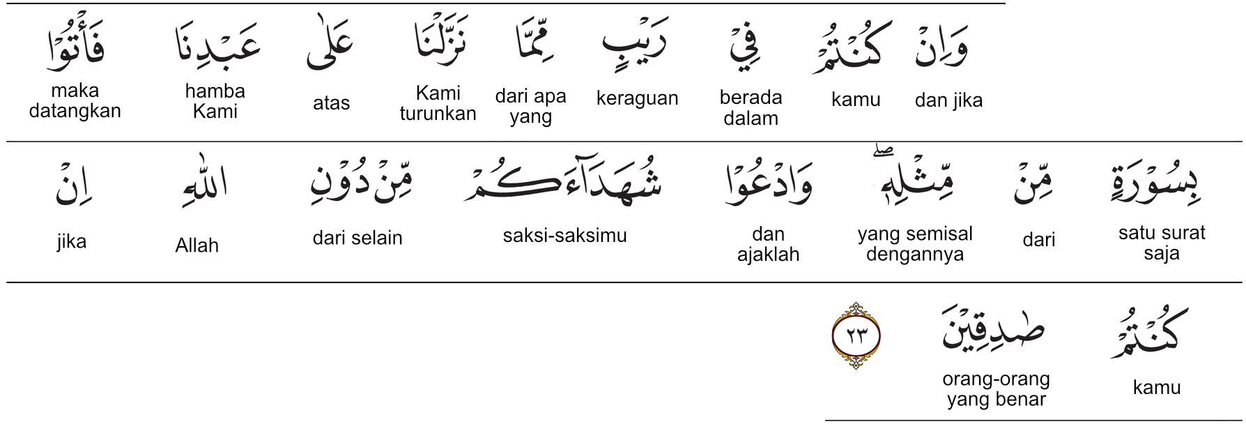وَإِنْ كُنْتُمْ فِي رَيْبٍ مِمَّا نَزَّلْنَا عَلَىٰ عَبْدِنَا فَأْتُوا بِسُورَةٍ مِنْ مِثْلِهِ وَادْعُوا شُهَدَاءَكُمْ مِنْ دُونِ اللَّهِ إِنْ كُنْتُمْ صَادِقِينَ