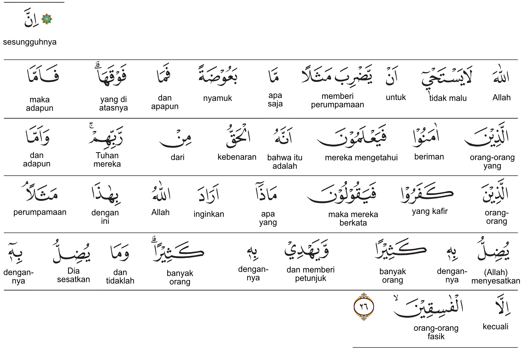 Kemenag RI 2019:Sesungguhnya Allah tidak segan membuat perumpamaan seekor nyamuk atau yang lebih kecil daripada itu. ) Adapun orang-orang yang beriman mengetahui bahwa itu kebenaran dari Tuhannya. Akan tetapi, orang-orang kafir berkata, “Apa maksud Allah dengan perumpamaan ini?” Dengan (perumpamaan) itu banyak orang yang disesatkan-Nya. ) Dengan itu pula banyak orang yang diberi-Nya petunjuk. Namun, tidak ada yang Dia sesatkan dengan (perumpamaan) itu, selain orang-orang fasik, ) Prof. Quraish Shihab:Sesungguhnya Allah tidak malu membuat perumpamaan (berupa) kutu atau yang melebihinya (kecil atau besar). Adapun orang-orang yang beriman, maka mereka mengetahui (dengan pasti) bahwasanya (perumpamaan itu) adalah haq (kebenaran yang sempurna) dari Tuhan Pemelihara mereka, tetapi orang-orang yang kafir mengatakan: "Apakah yang dikehendaki Allah dengan ini sebagai satu perumpamaan?” Dengannya (perumpamaan itu) banyak (orang) yang disesatkan-Nya (karena tidak mau mengerti dan dengannya (pula) banyak (orang) yang diberi-Nya petunjuk (berdasarkan kemauan dan kecenderungan masing-masing). Dan tidak ada yang disesatkan-Nya (dengan perumpamaan itu) kecuali orang-orang fasik (keluar dari ketaatan kepada Allah swt.). Prof. HAMKA:Sesungguhnya, Allah tidaklah malu membuat perumpamaan apa saja; nyamuk atau yang lebih kecil darinya. Maka, adapun orang-orang yang beriman mengetahui bahwasanya itu adalah kebenaran dari Tuhan mereka. Dan, adapun orang-orang yang kafir, berkatalah mereka, "Apa yang dikehendaki Allah dengan perumpamaan begini?" Tersesatlah dengan sebabnya kebanyakan manusia dan mendapat petunjuk dengan sebabnya kebanyakan. Dan, tidaklah akan tersesat dengan dia, melainkan orang-orang yang fasik.