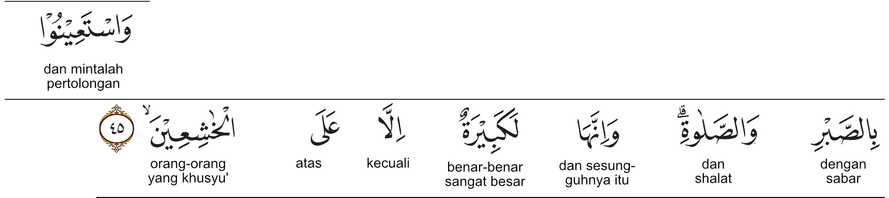 Kemenag RI 2019:Mohonlah pertolongan (kepada Allah) dengan sabar dan salat. Sesungguhnya (salat) itu benar-benar berat, kecuali bagi orang-orang yang khusyuk, Prof. Quraish Shihab:Mohonlah pertolongan (kepada Allah swt.) dengan sabar dan (mengerjakan) shalat. Dan sesungguhnya yang demikian itu benar-benar berat, kecuali bagi orang-orang yang khusyuk. Prof. HAMKA:Dan mohonlah pertolongan dengan sabar dan shalat. Dan sesungguhnya hal itu memang amat berat, kecuali atas orang-orang yang khusyu.