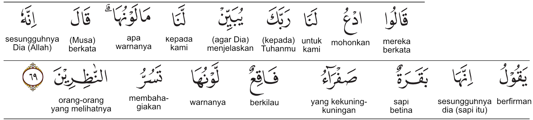 Kemenag RI 2019:Mereka berkata, “Mohonkanlah kepada Tuhanmu untuk kami agar Dia menjelaskan kepada kami apa warnanya.” Dia (Musa) menjawab, “Dia (Allah) berfirman bahwa (sapi) itu adalah sapi yang warnanya kuning tua, yang menyenangkan orang-orang yang memandang(-nya).” Prof. Quraish Shihab:Mereka berkata: “Mohonkanlah kepada Tuhan Memeliharamu untuk kami supaya Dia menerangkan kepada kami apa warnanya.” Dia (Nabi Musa as.) menjawab: “Sesungguhnya Dia berfirman bahwa ia adalah sapi yang kuning, yang kuning tua warnanya, (lagi) menyenangkan orang-orang yang memandang-(nya).” Prof. HAMKA:Mereka berkata, "Serulah untuk kami kepada Tuhan engkau, supaya Dia jelaskan kepada kami bagaimana warnanya." Berkata dia, "Sesungguhnya, Dia berfirman bahwa dianya ialah seekor lembu betina yang kuning, berkilau warnanya, menyenangkan mereka yang melihat."