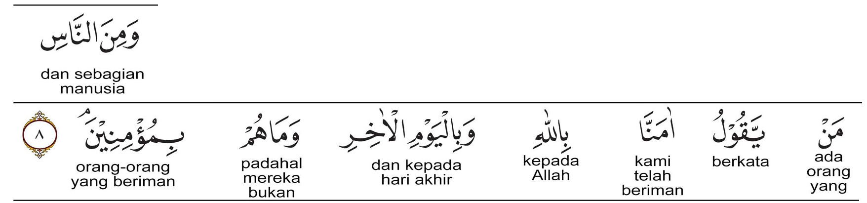 وَمِنَ النَّاسِ مَنْ يَقُولُ آمَنَّا بِاللَّهِ وَبِالْيَوْمِ الْآخِرِ وَمَا هُمْ بِمُؤْمِنِينَ