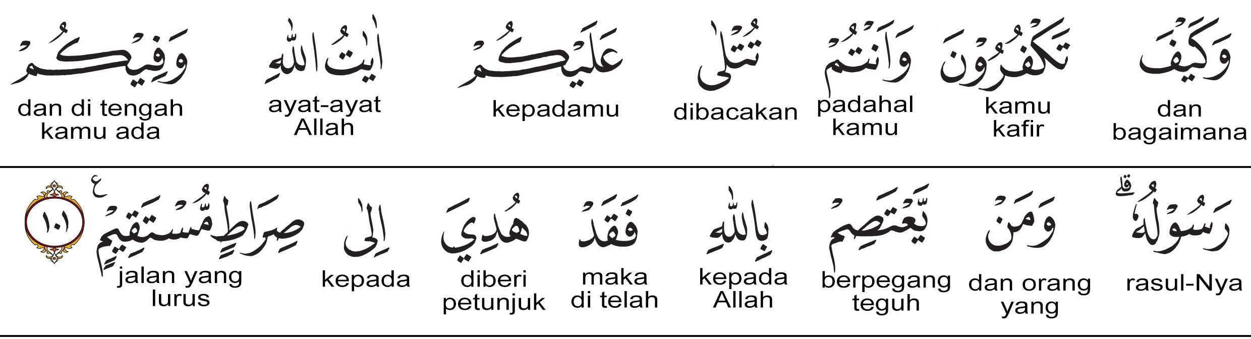 Kemenag RI 2019:Bagaimana kamu (sampai) menjadi kafir, padahal ayat-ayat Allah dibacakan kepada kamu dan Rasul-Nya (Nabi Muhammad) pun berada di tengah-tengah kamu? Siapa yang berpegang teguh pada (agama) Allah, sungguh dia telah diberi petunjuk ke jalan yang lurus. Prof. Quraish Shihab: