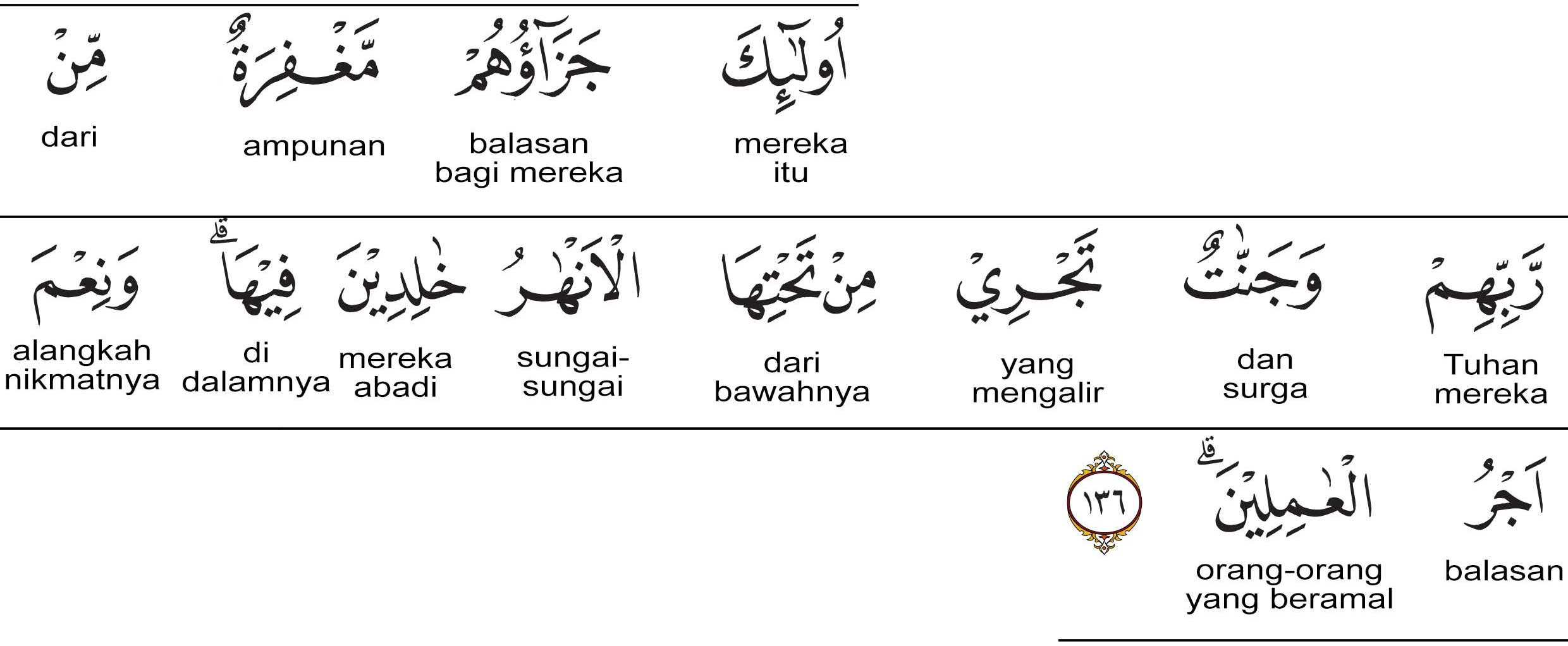Ayat ke-136 ini sambungan langsung dari ayat sebelumnya. Di ayat ini Allah SWT menyebutkan bahwa mereka mendapatkan dua jenis balasan, yaitu ampunan dan surga.
