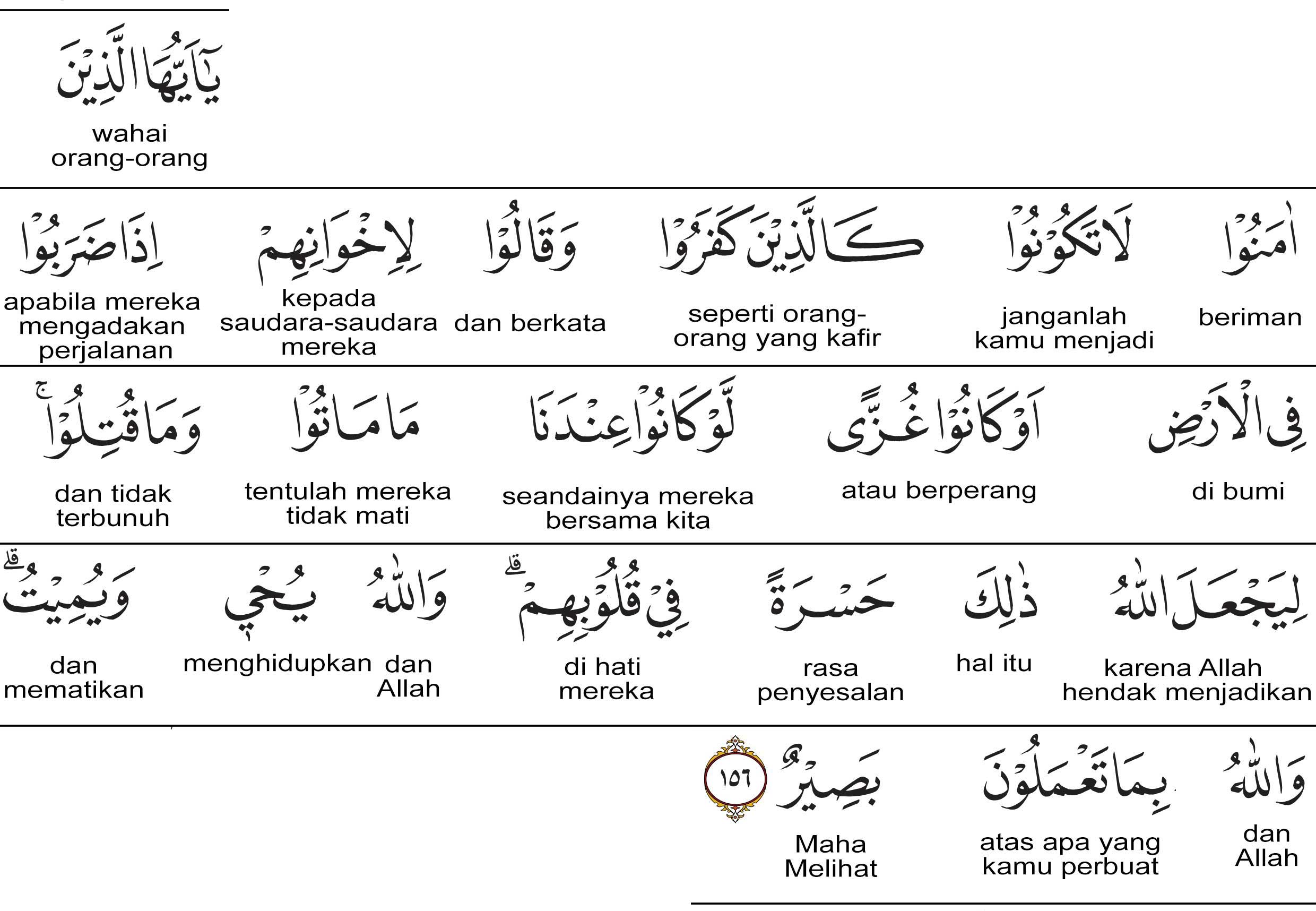 Wahai orang-orang yang beriman! Janganlah kamu jadi sebagai orang-orang yang kafir yang berkata kepada saudara-saudaranya, apabila mereka itu bepergian di bumi atau mereka jadi tentara, “Kalau mereka tinggal bersama kita,tentu mereka tidakakan mati dan tidak terbunuh.” Karena Allah hendak menjadikan yang demikian suatu penyesalan di hati mereka. Padahal Allah-lah yang menghidupkan dan yang mematikan. Dan Allah ada melihat yang kamu kerjakan.