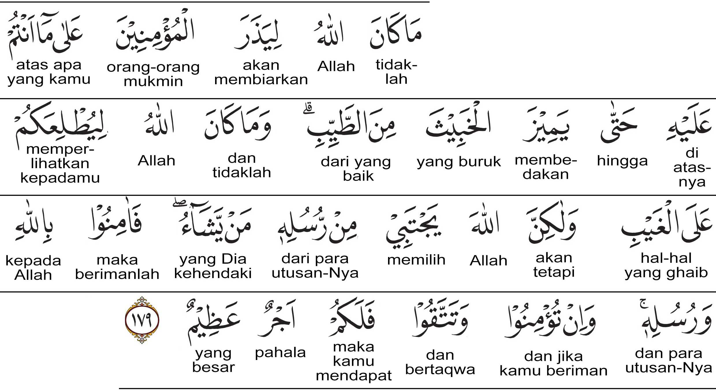 Allah sekali-kali tidak akan membiarkan orang-orang mukmin sebagaimana keadaan kamu selama ini (berbaur dan menyatu dengan orang-orang munafik), sehingga Dia membedakan yang buruk (orang-orang munafik) dari yang baik (orang-orang mukmin yang mantap imannya). Dan Allah sekali-kali tidak akan memperlihatkan kepada kamu yang gaib, tetapi Allah memilih siapa yang dikehendaki-Nya dari para rasul-Nya. Karena itu, berimanlah kepada Allah dan para rasul-Nya; dan jika kamu beriman dan bertakwa, maka bagi kamu pahala yang sangat besar.