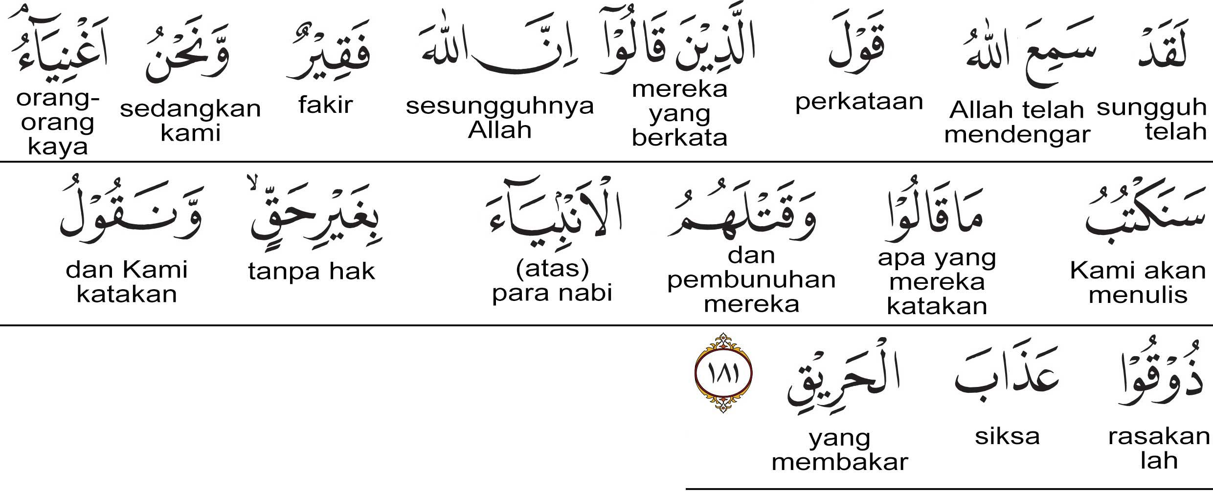 Demi (Allah)! Sungguh, Allah telah mendengar perkataan orang-orang yang mengatakan: “Sesungguhnya Allah miskin dan kami orang-orang kaya.” Kami akan mencatat perkataan mereka dan pembunuhan mereka terhadap para nabi tanpa (alasan) yang memang tidak dibenarkan, dan Kami akan mengatakan: “Rasakanlah azab yang membakar!”