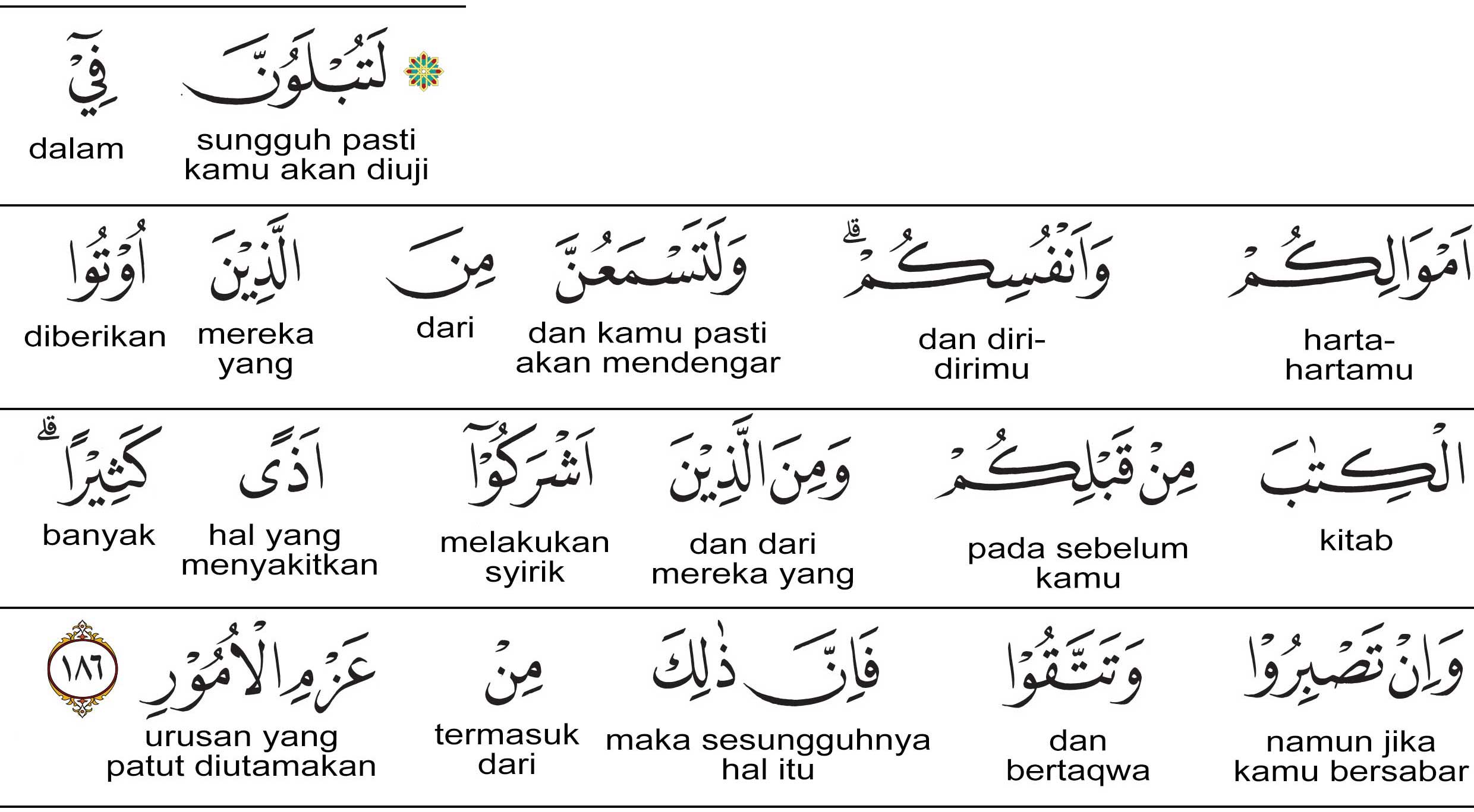 Pasti kamu benar-benar akan diuji menyangkut harta kamu dan diri kamu. Dan pasti kamu benar-benar akan mendengar dari orangorang yang diberi kitab sebelum kamu dan dari orang-orang yang menyekutukan (Allah swt. dengan yang lain), gangguan yang banyak. Jika kamu bersabar dan bertakwa, maka sesungguhnya yang demikian itu termasuk urusan yang patut diutamakan.