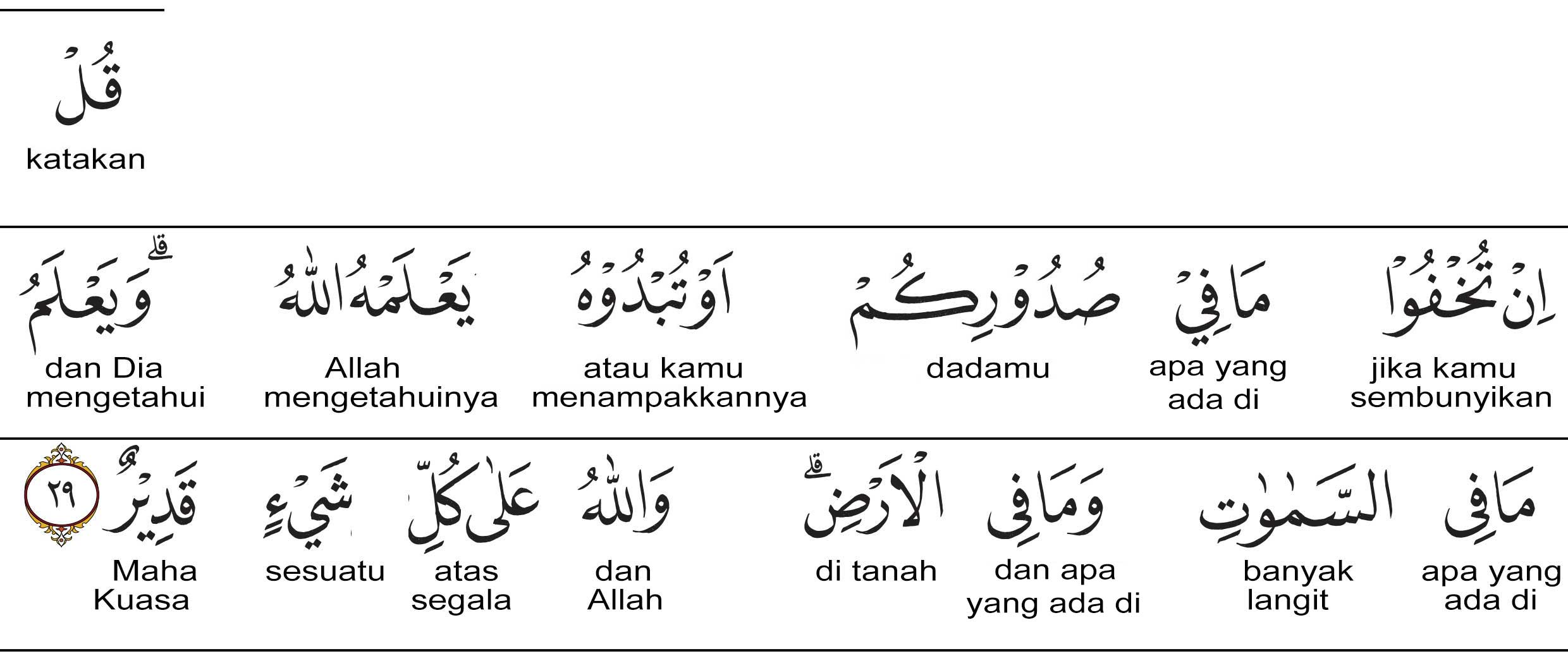 Katakanlah, "jika kamu menyembunyikan apa yang ada dalam hatimu atau kamu melahirkannya, pasti Allah mengetahui. "Allah mengetahui apa yang di langit dan apa yang di bumi. Dan Allah Mahakuasa atas segala sesuatu.