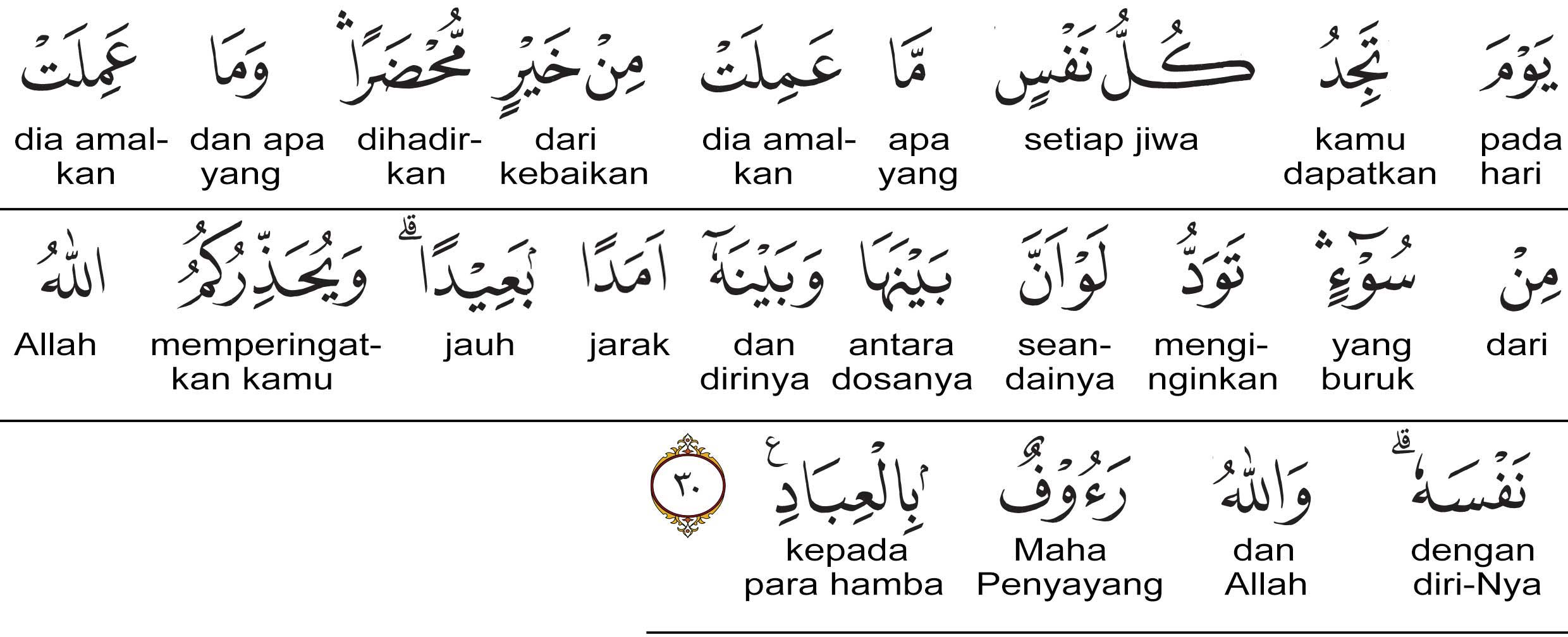 Pada hari ketika setiap jiwa menemukan segala apa yang telah dikerjakannya dari sedikit kebaikan pun dihadirkan (di hadapannya), dan apa yang telah dikerjakannya dari kejahatan; dia ingin kalau kiranya antara dia dengan kejahatan itu ada jarak yang jauh; dan Allah memperingatkan kamu terhadap diri (siksa)-Nya. Dan Allah Maha Penyayang kepada hamba-hamba-Nya.