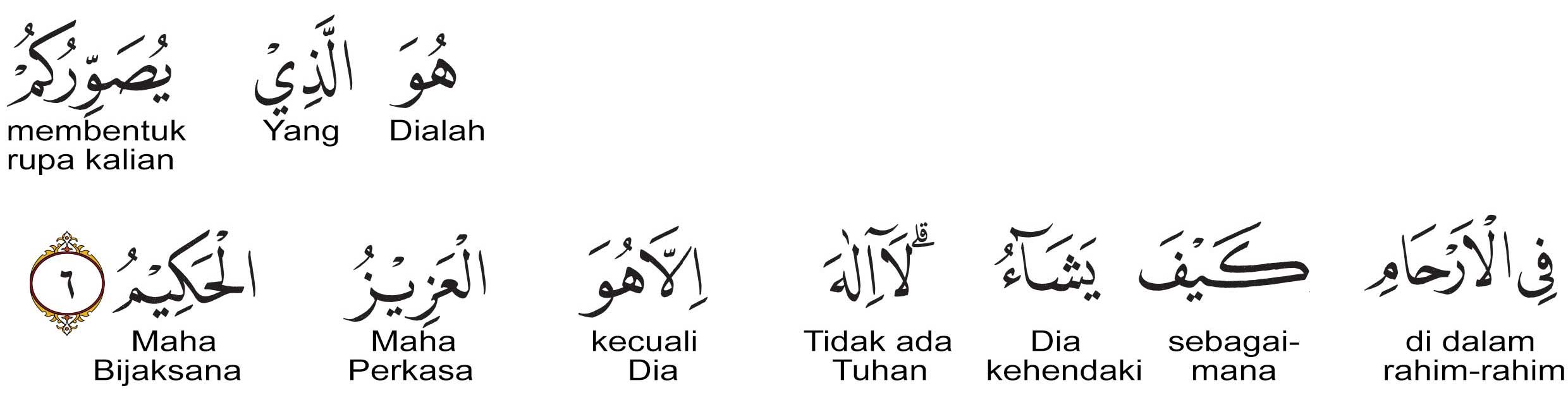 Dia-lah yang membentuk kamu dalam rahim sebagaimana dikehendaki-Nya. Tidak ada Tuhan (Yang Kuasa dan berhak disembah) melainkan Dia, Yang Maha Perkasa, lagi Maha Bijaksana.