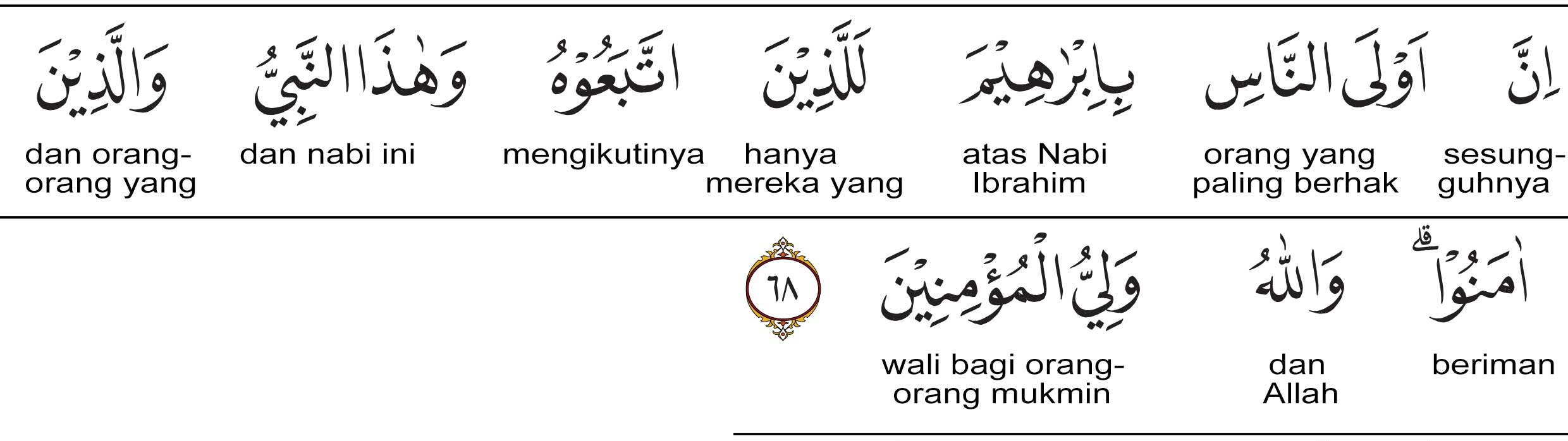 'Sesungguhnya orang yang paling dekat kepada Ibrahim ialah orang-orang yang bersungguh-sungguh mengikutinya dan Nabi ini serta orang-orang yang beriman, dan Allah adalah Pelindung semua orang-orang mukmin. "