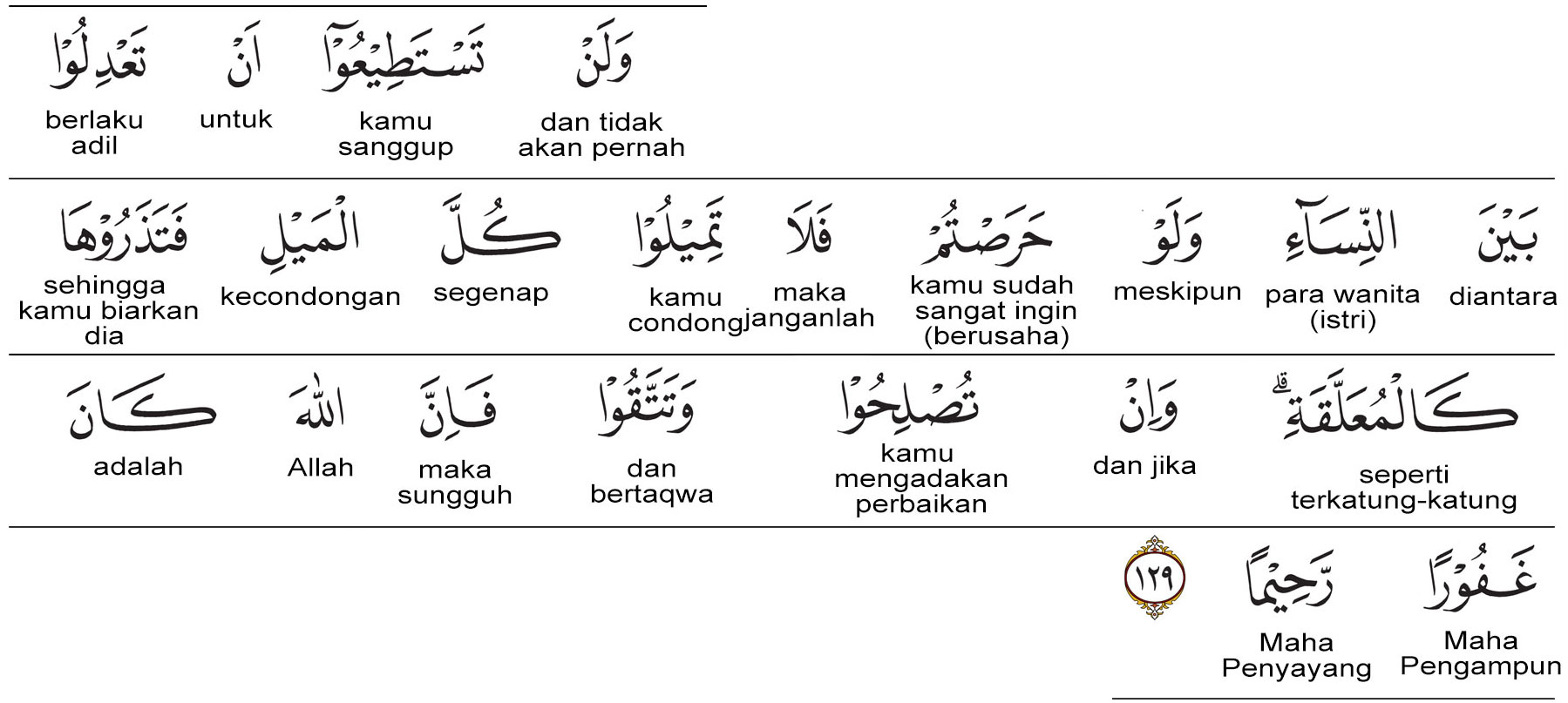 Kata tastathi’uu (تَسْتَطِيعُوا) artinya : kamu mampu. Kata an-ta’diluu (أَنْ تَعْدِلُوا) artinya : berlaku adil. Kata baina (بَيْنَ) artinya : di antara. Kata an-nisaa’ (النِّسَاءِ) artinya : para wanita. Dalam hal ini maksudnya para wanita yang menjadi istri-istri kamu.