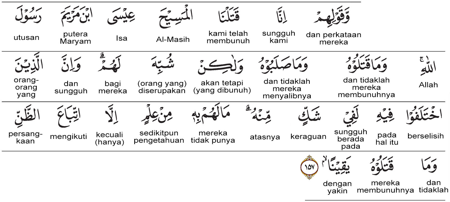 Kemenag RI 2019:(Kami menghukum pula mereka) karena ucapan mereka, “Sesungguhnya kami telah membunuh Almasih, Isa putra Maryam, Rasul Allah,” ) padahal mereka tidak membunuhnya dan tidak (pula) menyalibnya, tetapi (yang mereka bunuh adalah) orang yang menurut mereka menyerupai (Isa). Sesungguhnya mereka yang berselisih pendapat tentangnya (pembunuhan Isa), selalu dalam keragu-raguan terhadapnya. Mereka benar-benar tidak mengetahui (siapa sebenarnya yang dibunuh itu), kecuali mengikuti persangkaan belaka. (Jadi,) mereka tidak yakin telah membunuhnya. Prof. Quraish Shihab:Dan karena ucapan mereka, “Sesungguhnya kami telah membunuh al-Masih, ‘Isa putra Maryam, rasul Allah,” padahal mereka tidak membunuhnya dan tidak pula menyalibnya. Tetapi (yang mereka bunuh adalah) seseorang yang diserupakan bagi mereka. Sesungguhnya, orang-orang yang berselisih paham tentang itu benar-benar dalam keragu-raguan. Mereka tidak memiliki sedikit pun pengetahuan tentang hal itu selain mengikuti persangkaan belaka. Dan mereka tidak membunuhnya dengan yakin. Prof. HAMKA:Dan karena perkataan mereka, "Sesungguhnya kami telah membunuh Al-Masih, Isa putra Maryam, Rasul Allah." Padahal mereka tidak membunuhnya dan tidak pula menyalibnya, tetapi (yang mereka bunuh) diserupakan bagi mereka. Sesungguhnya orang-orang yang berselisih tentang hal itu berada dalam keraguan. Mereka tidak memiliki pengetahuan tentangnya, kecuali mengikuti sangkaan belaka. Dan mereka tidak membunuhnya secara pasti.