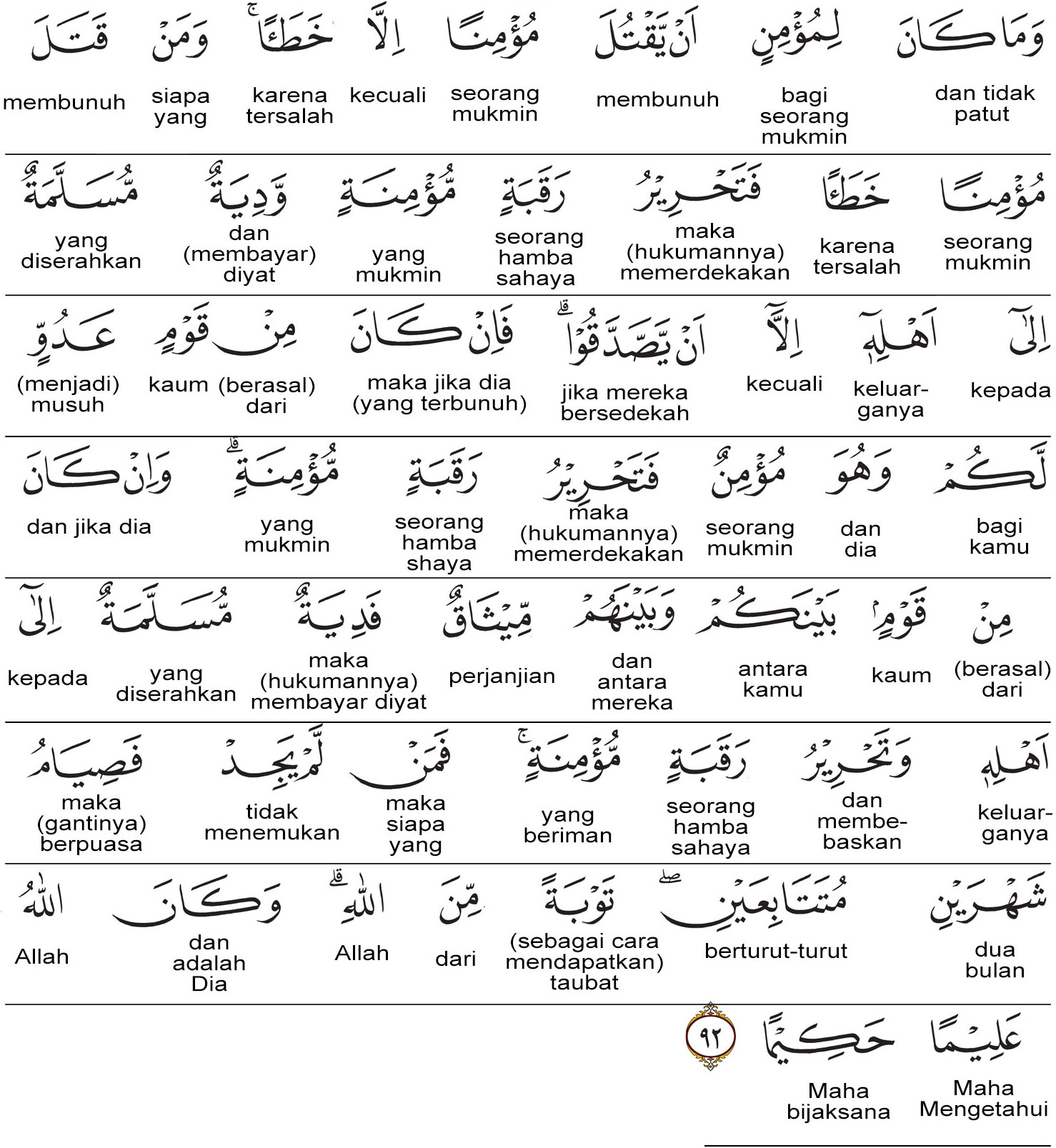 Kemenag RI 2019:Tidak patut bagi seorang mukmin membunuh seorang mukmin, kecuali karena tersalah (tidak sengaja). Siapa yang membunuh seorang mukmin karena tersalah (hendaklah) memerdekakan seorang hamba sahaya mukmin dan (membayar) tebusan yang diserahkan kepada keluarganya (terbunuh), kecuali jika mereka (keluarga terbunuh) membebaskan pembayaran. Jika dia (terbunuh) dari kaum yang memusuhimu, padahal dia orang beriman, (hendaklah pembunuh) memerdekakan hamba sahaya mukmin. Jika dia (terbunuh) dari kaum (kafir) yang ada perjanjian (damai) antara mereka dengan kamu, (hendaklah pembunuh) membayar tebusan yang diserahkan kepada keluarganya serta memerdekakan hamba sahaya mukmin. Siapa yang tidak mendapatkan (hamba sahaya) hendaklah berpuasa dua bulan berturut-turut sebagai (ketetapan) cara bertobat dari Allah. Allah Maha Mengetahui lagi Maha Bijaksana. Prof. Quraish Shihab:Dan tidak (ada kepatuhan, bahkan tidak ada wujudnya) bagi seorang mukmin membunuh seorang mukmin, kecuali karena tersalah (atau tidak disengaja), dan barang siapa membunuh seorang mukmin karena tersalah, maka (wajiblah) dia memerdekakan seorang hamba sahaya mukmin serta membayar diat¹³? yang diserahkan kepada keluarganya (yakni keluarga yang terbunuh), kecuali jika mereka (keluarga terbunuh) bersedekah (atau membebaskan keluarga pembunuh dari membayar diat). Jika si terbunuh dari kaum yang memusuhi kamu padahal dia mukmin, maka (wajiblah bagi si pembunuh) memerdekakan hamba sahaya mukmin. Dan jika dia (si pembunuh dari kaum yang telah ada perjanjian (damai dan tidak saling menyerang) antara kamu dengan mereka, maka (wajiblah baginya) membayar diat yang diserahkan kepada keluarga terbunuh serta memerdekakan hamba sahaya mukmin. Barang siapa tidak memperolehnya (yakni diat), maka wajiblah dia (si pembunuh) berpuasa dua bulan berturut-turut sebagai (ketetapan cara) taubat dari Allah. Dan adalah Allah Maha Mengetahui, lagi Maha Bijaksana. Prof. HAMKA:Dan tidaklah ada bagi seorang Mukmin membunuh seorang Mukmin lain kecuali karena keliru. Dan barangsiapa membunuh seorang Mukmin dengan keliru, hendaklah memerdekakan seorang budak yang Mukmin, dan diyat yang diserahkan kepada keluarganya, kecuali jika mereka bersedekah. Akan tetapi jika yang terbunuh itu dari kaum yang menjadi musuh bagi kamu, padahal dia seorang Mukmin, maka hendaklah memerdekakan seorang budak yang Mukmin pula. Dan jika yang terbunuh itu dari suatu kaum yang di antara kamu dan mereka ada suatu perjanjian, maka diyat yang diserahkan kepada keluarganya dan memerdekakan seorang budak yang Mukmin. Tetapi barangsiapa tidak mendapat, maka dengan puasa dua bulan berturut-turut, sebagai tobat dari Allah. Dan adalah Allah itu Mahatahu, lagi Bijaksana.