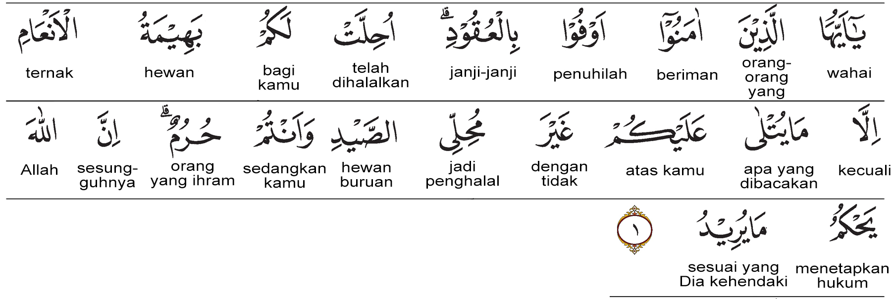 Kemenag RI 2019:Wahai orang-orang yang beriman, penuhilah janji-janji! ) Dihalalkan bagimu hewan ternak, kecuali yang akan disebutkan kepadamu (keharamannya) dengan tidak menghalalkan berburu ketika kamu sedang berihram (haji atau umrah). Sesungguhnya Allah menetapkan hukum sesuai dengan yang Dia kehendaki. Prof. Quraish Shihab:Hai orang-orang yang beriman! Penuhilah akad-akad. Dihalalkan bagi kamu binatang ternak, kecuali apa yang akan dibacakan (disampaikan) kepada kamu, dengan tidak menghalalkan berburu ketika kamu sedang dalam keadaan berihram. Sesungguhnya Allah menetapkan hukum menurut yang Dia kehendaki. Prof. HAMKA:Wahai orang-orang yang beriman! Sempurnakanlah perjanjian-perjanjian (yang telah kamu buat)! Dihalalkan bagi kamu binatang ternak, kecuali yang akan disebutkan nanti, dalam keadaan tidak menghalalkan buruan saat kamu berihram. Sesungguhnya Allah memutuskan apa yang Dia kehendaki.