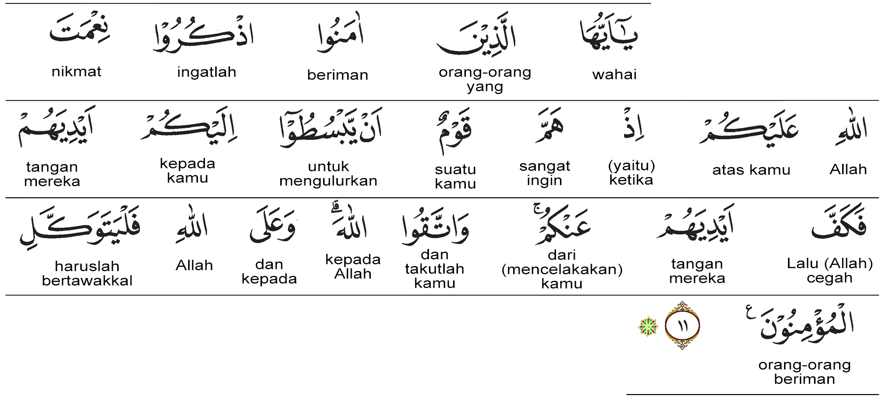 Ingatlah nikmat Allah kepada kamu ketika suatu kaum bermaksud hendak menggerakkan tangan mereka kepada kamu (untuk berbuat jahat, membunuh, atau memerangi kamu), lalu Allah menahan tangan mereka dari kamu. Maka bertakwalah kepada Allah, dan hendaknya kepada Allah saja orang-orang mukmin bertawakkal. Prof. HAMKA:Wahai orang-orang yang beriman! Ingatlah nikmat Allah atas kamu, ketika suatu kaum berniat jahat untuk mengulurkan tangan mereka kepadamu, namun Allah menghalangi tangan mereka itu dari kamu. Dan bertakwalah kepada Allah, dan hanya kepada Allah hendaknya orang-orang yang beriman bertawakal.