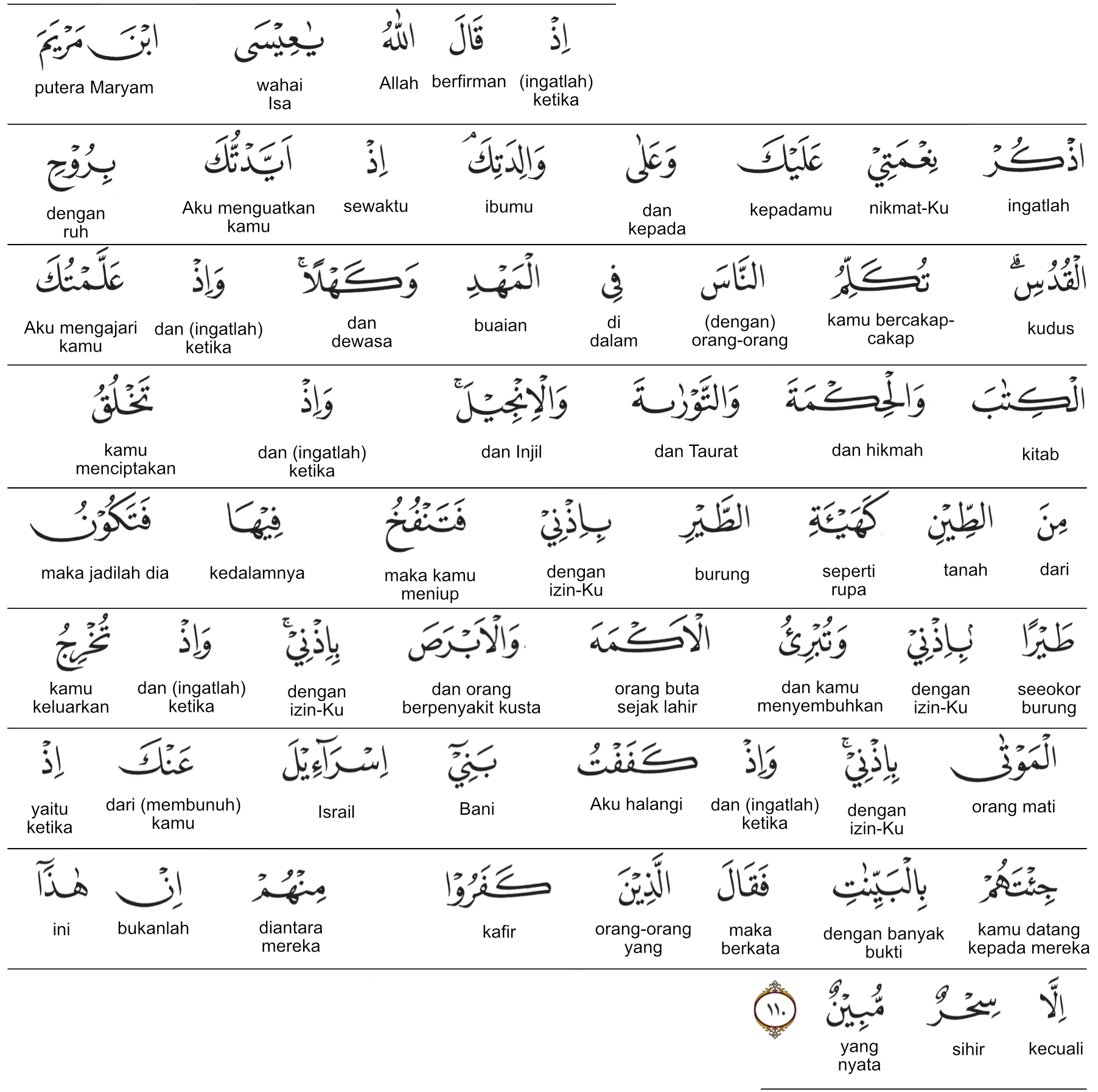Kemenag RI 2019:(Ingatlah) ketika Allah berfirman, “Wahai Isa putra Maryam, ingatlah nikmat-Ku kepadamu dan kepada ibumu sewaktu Aku menguatkanmu dengan Ruhulkudus. Engkau dapat berbicara dengan manusia pada waktu masih dalam buaian dan setelah dewasa. (Ingatlah) ketika Aku mengajarkan menulis kepadamu, (juga) hikmah, Taurat, dan Injil. (Ingatlah) ketika engkau membentuk dari tanah (sesuatu) seperti bentuk burung dengan seizin-Ku, kemudian engkau meniupnya, lalu menjadi seekor burung (yang sebenarnya) dengan seizin-Ku. (Ingatlah) ketika engkau menyembuhkan orang yang buta sejak lahir dan orang yang berpenyakit kusta dengan seizin-Ku. (Ingatlah) ketika engkau mengeluarkan orang mati (dari kubur menjadi hidup) dengan seizin-Ku. (Ingatlah) ketika Aku menghalangi Bani Israil (dari keinginan mereka membunuhmu) pada waktu engkau mengemukakan kepada mereka keterangan-keterangan yang nyata, lalu orang-orang kafir di antara mereka berkata, “Ini tidak lain hanyalah sihir yang nyata.” Prof. Quraish Shihab:(Ingatlah), ketika Allah berfirman: “Wahai ‘Isa putra Maryam! Ingatlah nikmat-Ku kepadamu dan kepada ibumu ketika Aku menguatkanmu dengan Ruh Al-Qudus (Malaikat Jibril as.). Engkau (dapat) berbicara dengan manusia ketika (masih) dalam buaian dan sesudah dewasa; dan (ingatlah) ketika Aku mengajarmu tulis menulis, Hikmah, serta Taurat dan Injil, dan (ingatlah pula) ketika engkau membuat dari tanah (sesuatu) yang seperti bentuk burung dengan izin-Ku, lalu engkau meniup padanya, lalu ia menjadi seekor burung dengan izin-Ku. Dan (ingatlah), ketika engkau menyembuhkan orang yang buta sejak lahir dan orang yang berpenyakit kusta dengan izin-Ku, dan (ingatlah) ketika engkau mengeluarkan (menghidupkan kembali) orang-orang mati dengan izin-Ku, dan ketika Aku menghalangi Bani Israil (untuk menganiaya dan membunuhmu) ketika engkau membawa kepada mereka keterangan-keterangan yang nyata, lalu orang-orang kafir di antara mereka berkata: “Ini tidak lain hanyalah sihir yang nyata.” Prof. HAMKA:(Ingatlah) tatkala berkata Allah kepada Isa anak Maryam, "Ingatlah oleh engkau akan nikmat-Ku atas engkau dan ke atas ibumu, tatkala Aku menyokong engkau dengan Ruhul-Qudus engkau berkata-kata dengan manusia dalam ayunan dan di kala dewasa. Dan (ingatlah) tatkala Aku ajarkan kepada engkau tulisan dan hikmah, Taurat, dan Injil, dan (ingatlah) tatkala engkau menjadikan dari tanah seperti bentuk burung dengan izin-Ku lalu engkau embuskan padanya maka jadilah dia burung dengan izin-Ku, dan engkau sembuhkan orang buta dan penyakit sopak dengan izin-Ku. Dan (ingatlah) tatkala engkau menghidupkan orang yang sudah mati dengan izin-Ku. Dan (ingatlah) tatkala Aku menghambat Bani Israil dari engkau, tatkala engkau datang kepada mereka dengan keterangan-keterangan, lantas berkatalah orang-orang yang kafir di antara mereka 'Ini tidak lain melainkan sihir yang nyata.'"