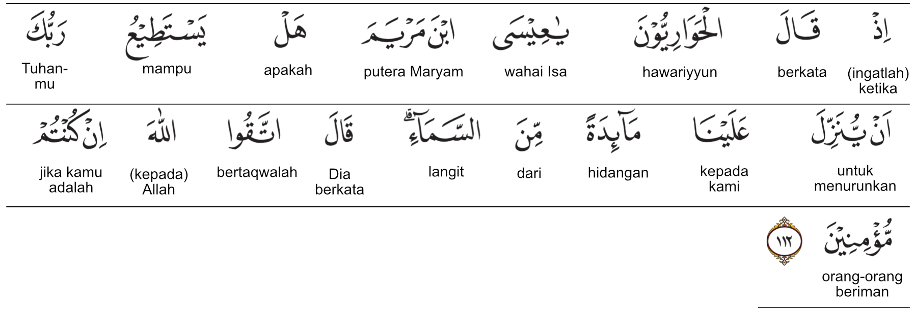Kemenag RI 2019:(Ingatlah) ketika para pengikut setia Isa berkata, “Wahai Isa putra Maryam, sanggupkah (bersediakah) Tuhanmu menurunkan hidangan dari langit kepada kami?” Isa menjawab, “Bertak-walah kepada Allah jika kamu orang-orang mukmin.” Prof. Quraish Shihab:(Ingatlah), ketika Hawariyyin (para pengikut setia Nabi ‘Isa as.) berkata: “Wahai ‘Isa putra Maryam! Mampukah Tuhan Pemeliharamu menurunkan untuk kami hidangan dari langit?” Dia (Nabi ‘Isa as.) menjawab: “Bertakwalah kepada Allah jika kamu benar-benar orang-orang mukmin.” Prof. HAMKA:(Ingatlah) tatkala Hawariy?n itu berkata, “Wahai Isa anak Maryam! Apakah berkuasa Tuhan engkau menurunkan kepada kami suatu hidangan dari langit?” Jawabnya, “Takutlah kepada Allah jika betul-betul kamu orang-orang yang beriman.”