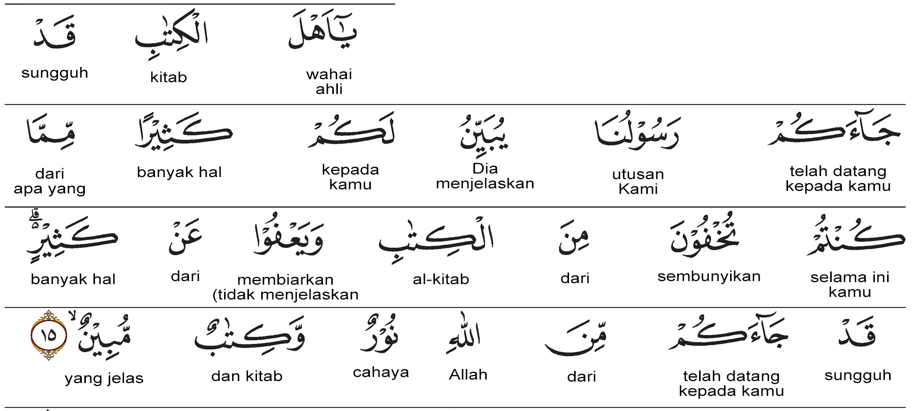 Kata yubayyinu lakum (يُبَيِّنُ لَكُمْ) artinya : menjelaskan kepada kamu. Kata katsiran (كَثِيرًا) artinya : banyak hal. Kata mimma (مِمَّا) artinya : dari apa, yaitu isi kitab suci. Kata kuntum tukhfuna (كُنْتُمْ تُخْفُونَ) artinya : kamu menyembunyikan. Kata minal kitabi (مِنَ الْكِتَابِ) artinya : dari kitab.