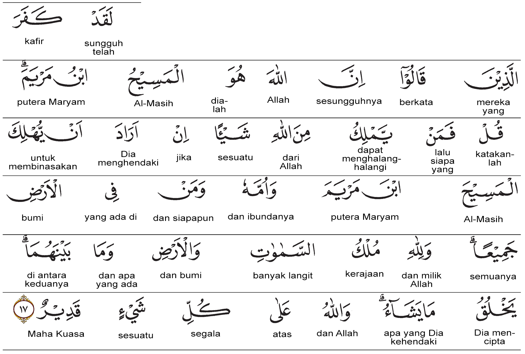 Milik Allah-lah kerajaan langit dan bumi serta apa yang ada di antara keduanya. Dia menciptakan apa yang dikehendaki-Nya, dan Allah Maha Kuasa atas segala sesuatu. Prof. HAMKA:Sesungguhnya orang-orang yang mengatakan bahwa Allah itu adalah al-Masih anak Maryam, mereka telah kafir. Katakanlah, "Jika demikian, siapa yang memiliki kekuasaan untuk menahan sesuatu dari Allah, jika Dia ingin membinasakan al-Masih anak Maryam, ibunya, dan semua orang yang ada di bumi? Bagi Allah-lah kekuasaan atas segala langit dan bumi, dan apa yang ada di antara keduanya. Dia menciptakan apa yang Dia kehendaki, dan Allah Maha Kuasa atas segala sesuatu."
