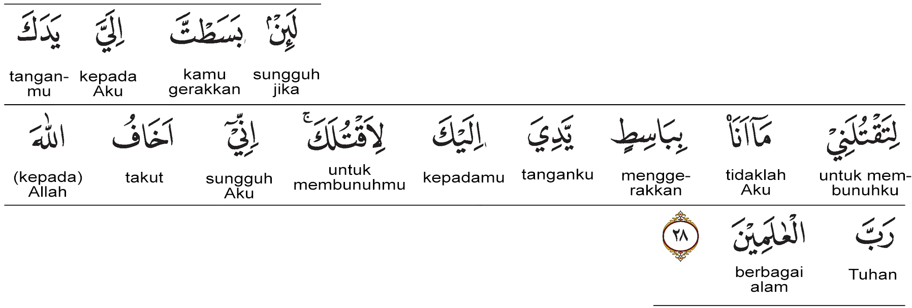 Kemenag RI 2019:Sesungguhnya jika engkau (Qabil) menggerakkan tanganmu kepadaku untuk membunuhku, aku tidak akan menggerakkan tanganku kepadamu untuk membunuhmu. Sesungguhnya aku takut kepada Allah, Tuhan semesta alam. Prof. Quraish Shihab:Sungguh, jika engkau benar-benar