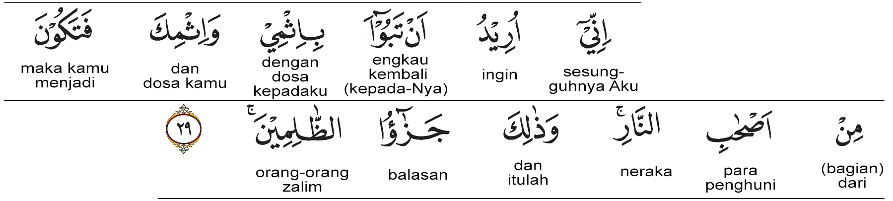 Kemenag RI 2019:Sesungguhnya aku ingin engkau kembali (kepada-Nya) dengan (membawa) dosa (karena membunuh)-ku dan dosamu (sebelum itu) sehingga engkau akan termasuk penghuni neraka. Itulah balasan bagi orang-orang yang zalim.” Prof. Quraish Shihab:Sesungguhnya aku ingin supaya