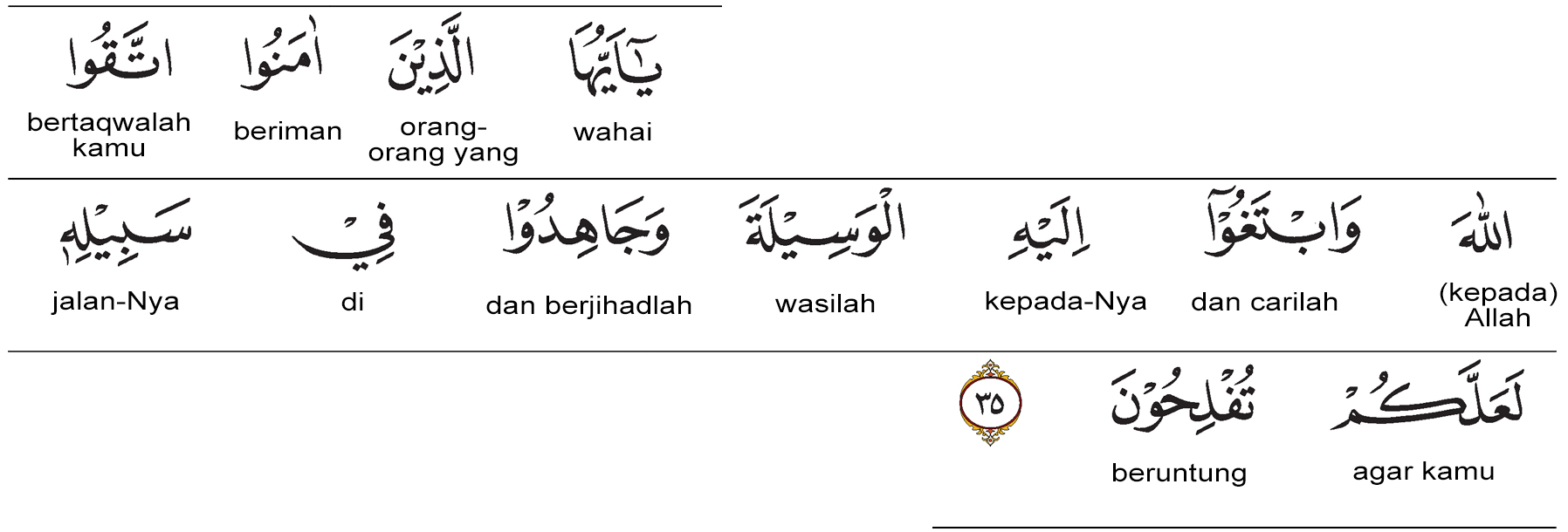 Wahai orang-orang yang beriman, bertakwalah kepada Allah, carilah wasilah (jalan untuk mendekatkan diri) kepada-Nya, dan berjihadlah (berjuanglah) di jalan-Nya agar kamu beruntung.