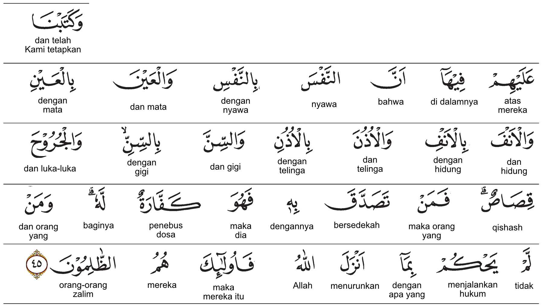 Kemenag RI 2019:Kami telah menetapkan bagi mereka (Bani Israil) di dalamnya (Taurat) bahwa nyawa (dibalas) dengan nyawa, mata dengan mata, hidung dengan hidung, telinga dengan telinga, gigi dengan gigi, dan luka-luka (pun) ada kisasnya (balasan yang sama). Siapa yang melepaskan (hak kisasnya), maka itu (menjadi) penebus dosa baginya. Siapa yang tidak memutuskan (suatu urusan) menurut ketentuan yang diturunkan Allah, maka mereka itulah orang-orang zalim. Prof. Quraish Shihab: Prof. HAMKA:Dan telah Kami wajibkan atas mereka di dalamnya, bahwasanya jiwa (balas) dengan jiwa, mata dengan mata, hidung dengan hidung, telinga dengan telinga, gigi dengan gigi, dan luka-luka ada qisasnya. Maka barangsiapa yang mendermakan hak balas itu maka adalah itu penebus baginya. Dan barangsiapa yang tidak menghukum dengan apa yang diturunkan Allah, maka mereka itu adalah orang-orang yang aniaya.