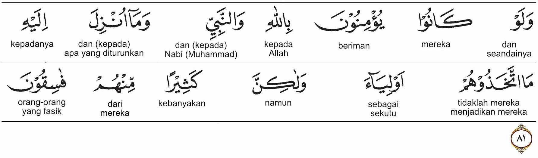 Prof. Quraish Shihab: Jika seandainya mereka (Ahl al- Kitab) beriman kepada Allah, kepada Nabi (Nabi Musa as. atau kepada Nabi Muhammad saw.) dan kepada apa yang diturunkan kepadanya (berupa Taurat atau al-Qur’an), tentu mereka tidak akan menjadikan mereka (orang-orang kafir itu) sebagai wali (teman dekat dan penolong), tetapi banyak dari mereka adalah orang-orang fasik (keluar dari ketaatan kepada Allah swt.)