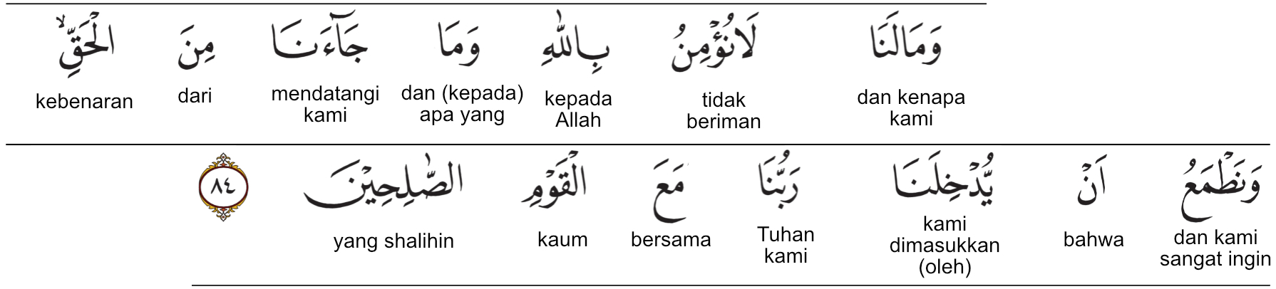 Prof. HAMKA: Mengapalah kami tidak akan beriman kepada Allah dan kepada yang datang kepada kami daripada kebenaran dan rindulah kami akan dimasukkan kami oleh Tuhan kami beserta kaum yang saleh.