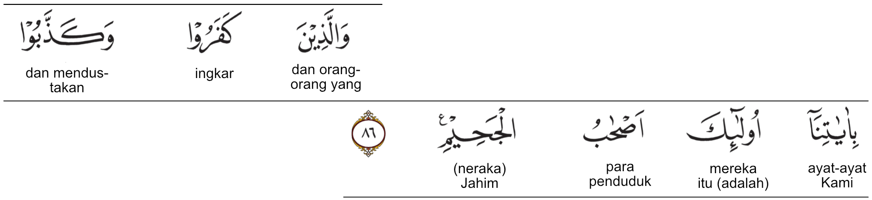 Prof. Quraish Shihab: Adapun orang-orang yang kafir dan mendustakan ayat-ayat Kami (baik yang terbaca maupun yang terhampar di alam semesta), mereka itu adalah para penghuni (neraka) Jahim.