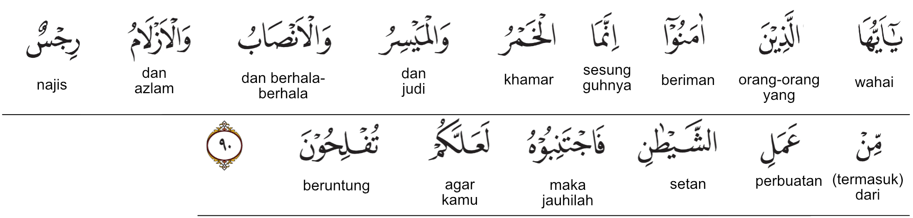 Kemenag RI 2019:Wahai orang-orang yang beriman, sesungguhnya minuman keras, berjudi, (berkurban untuk) berhala, dan mengundi nasib dengan anak panah adalah perbuatan keji (dan) termasuk perbuatan setan. Maka, jauhilah (perbuatan-perbuatan) itu agar kamu beruntung. Prof. Quraish Shihab:Hai orang-orang yang beriman! Sesungguhnya khamr (segala yang memabukkan walau sedikit), judi, (berkurban untuk) berhala-berhala, dan panah-panah (yang digunakan untuk mengundi nasib) adalah perbuatan keji yang termasuk perbuatan setan. Maka jauhilah perbuatan-perbuatan itu agar kamu memperoleh keberuntungan. Prof. HAMKA:Wahai orang-orang yang beriman! Sesungguhnya, arak dan judi dan sembelihan untuk berhala dan undi-undi nasib adalah kotor dari pekerjaan setan. Maka hendaklah kamu jauhi ia, supaya kamu beroleh kejayaan.