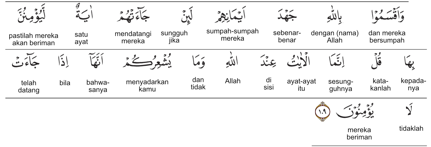 Kemenag RI 2019:Mereka bersumpah dengan (nama) Allah dengan sebenar-benarnya sumpah (bahwa) sungguh jika datang suatu bukti (mukjizat) kepada mereka, pastilah mereka akan beriman kepadanya. Katakanlah, “Sesungguhnya bukti-bukti itu hanya ada pada sisi Allah.” Kamu tidak akan mengira bahwa jika bukti (mukjizat) itu datang, mereka tidak juga akan beriman. ) Prof. Quraish Shihab:Mereka (kaum musyrik) bersumpah dengan sungguh-sungguh menggunakan (nama) Allah, bahwa sesungguhnya jika datang kepada mereka suatu mukjizat, pastilah mereka akan beriman kepadanya. Katakanlah (Nabi Muhammad saw.): “Sesungguhnya mukjizat-mukjizat itu hanya ada pada sisi Allah.” Dan apakah yang memberitahumu bahwa apabila mukjizat datang, mereka (juga tetap) tidak akan beriman? Prof. HAMKA:Dan bersumpahlah mereka dengan nama Allah, sebenar-benar persumpahan jika datang kepada mereka suatu ayat, sungguh-sungguh mereka akan beriman! Katakanlah, "Ayat-ayat itu tidaklah ada hanya pada sisi Allah!" Dan kalaupun diwariyatkan kepada kamu bahwasanya ayat ayat itu apabila datang, mereka tidak juga akan beriman.