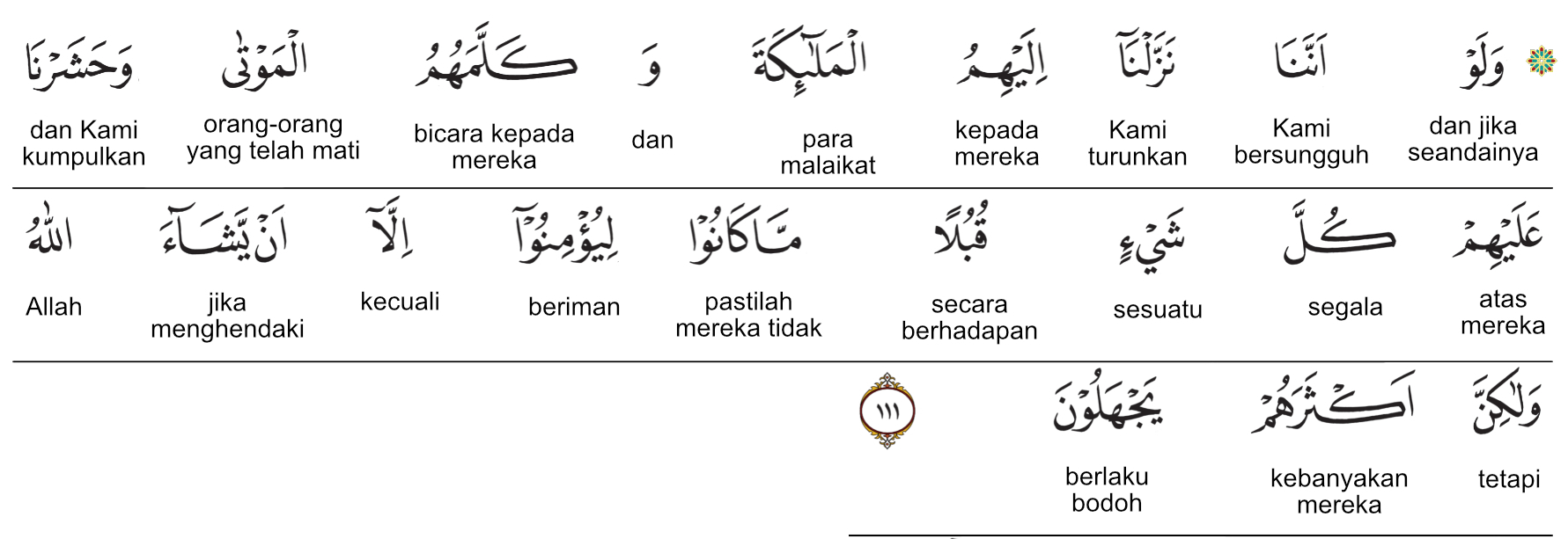 Kemenag RI 2019:Seandainya Kami benar-benar menurunkan malaikat kepada mereka (sebagai saksi kebenaran Rasul), orang yang telah mati pun (Kami hidupkan kembali lalu) berbicara dengan mereka, dan Kami kumpulkan di hadapan mereka segala sesuatu (yang mereka inginkan), mereka tidak juga akan beriman, kecuali jika Allah menghendaki. Namun, kebanyakan mereka tidak mengetahui (hakikat ini). Prof. Quraish Shihab:Dan jika seandainya Kami menurunkan para malaikat kepada mereka (kaum musyrik), dan orang-orang yang mati berbicara dengan mereka, dan Kami mengumpulkan segala sesuatu ke hadapan mereka, tentu mereka tidak (juga) akan beriman, kecuali jika Allah menghendaki (berdasarkan kecenderungan dan pilihan masing-masing), tetapi kebanyakan mereka tidak mengetahui (hakikat ini). Prof. HAMKA:Dan walaupun Kami turunkan kepada mereka malaikat dan Kami percakapkan kepada mereka orang mati, dan Kami kumpulkan atas mereka segala sesuatu berhadapan, niscaya tidaklah mereka akan beriman kecuali bahwa Allah menghendaki. Tetapi, kebanyakan mereka tidak tahu.